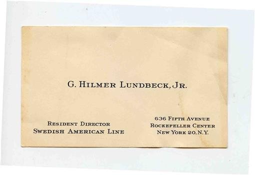 A G Hilmer Lundbeck Jr., Resident Director , Swedish American Lines Business Card . Circa 1960's.