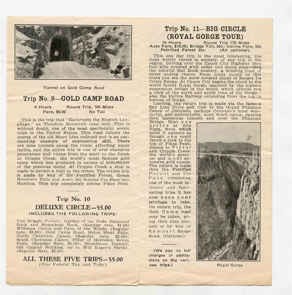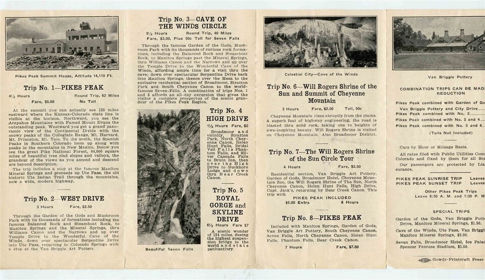 A well illustrated 8 panel fold out brochure with photos and detailed tour information with fares. Finney Sons Sightseeing Brochure Pikes Peak Region Scenic Trips Colorado