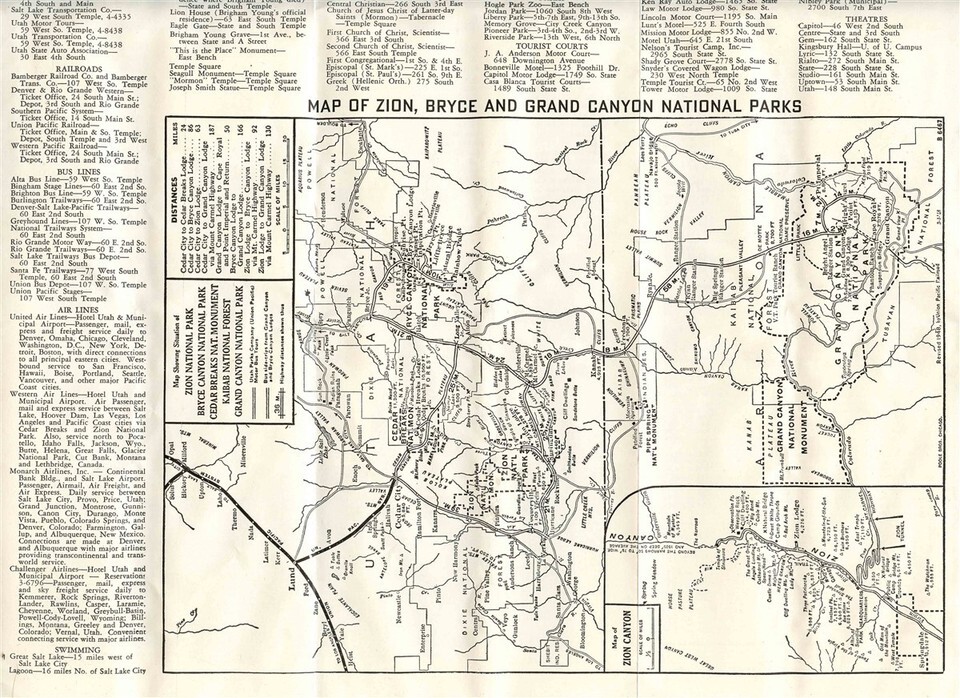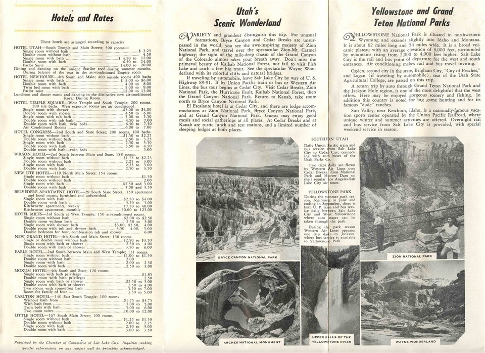 A 20 panel fold out brochure with many B W photos, hisotry, tour suggestions, maps of SLC, and of Zion, Bryce and Garnd Canton National Parks, Hotels and Rates and much more. Circa 1930's.