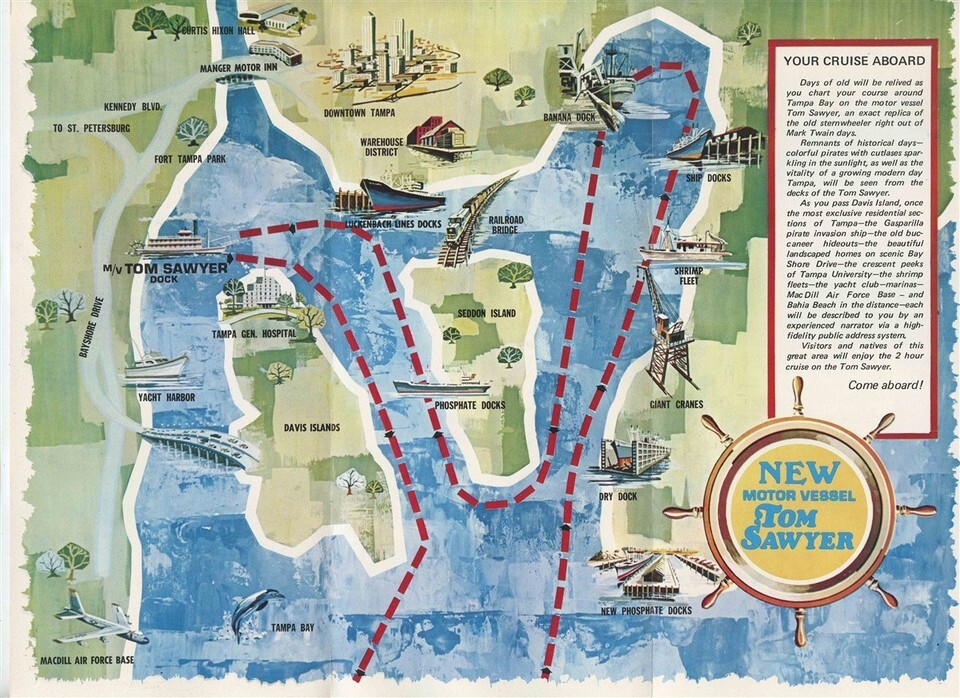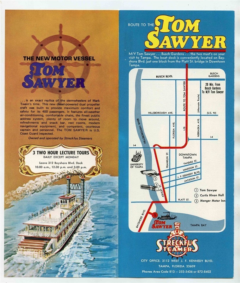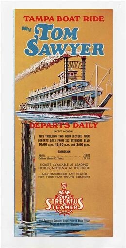 A full color fold out brochure with route map and information on one side and Ship Pictures, Area map and information on the other side. M/V Tom Sawyer Tampa Boat Ride Brochure . From Streckfus Steamers in Tampa Florida . With Schedule, fares and more