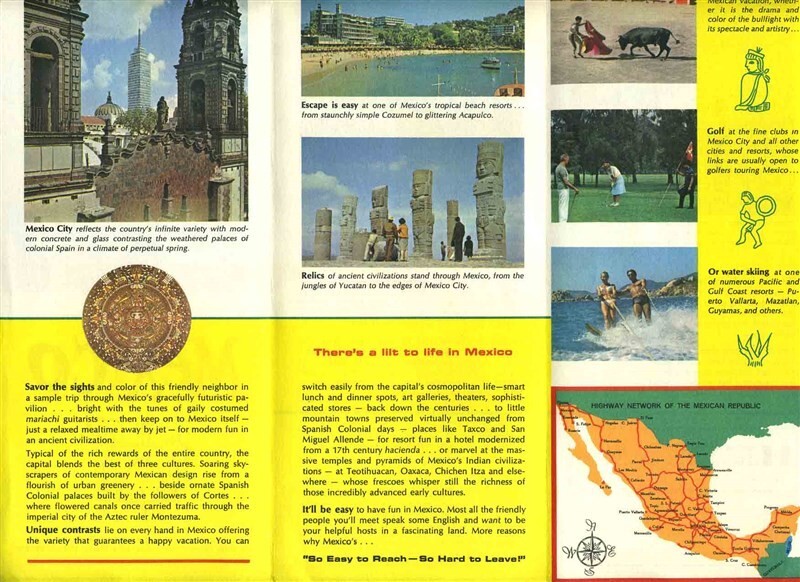 There are 2 different full color fold out brochures in this lot. Both are from Mexico at the New York Worlds Fair 1964-1965. There is a 6 panel fold out brochure of All Your Life, You'll Remember Mexico and a 12 panel fold out on Mexican Art and development.