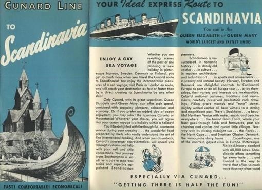 A well illustrated 16 panel fold out brochure on Cunard Line Cruises to Scandinavia on the Queen Elizabeth for the 1952 Season. In fine condition. Many photos of the Queen Elizabeth and the Scandinavian Ports. With Fares and Running Times, detailed port information, route map and much more.