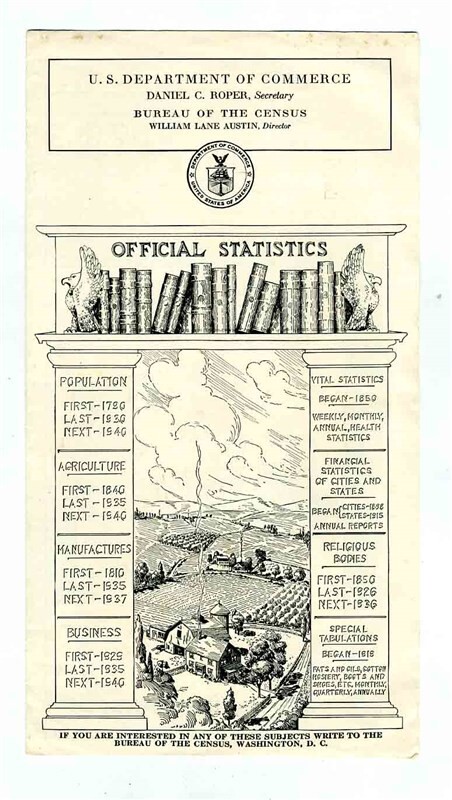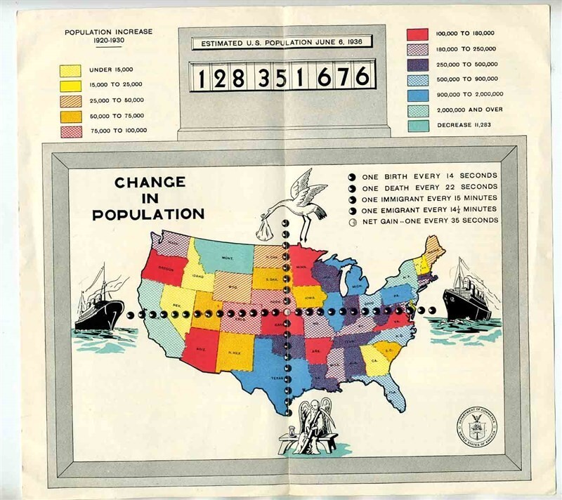 Department of Commerce 1936 United States Census Population Map A fascinating 4 page brochure with the estimated population of the United States as of June 6, 1936. In fine condition. A wonderful multi color US map showing changes in population. Published by the Department of Commerce. On the back page are A FEW FACTS, referring to TEXAS.
