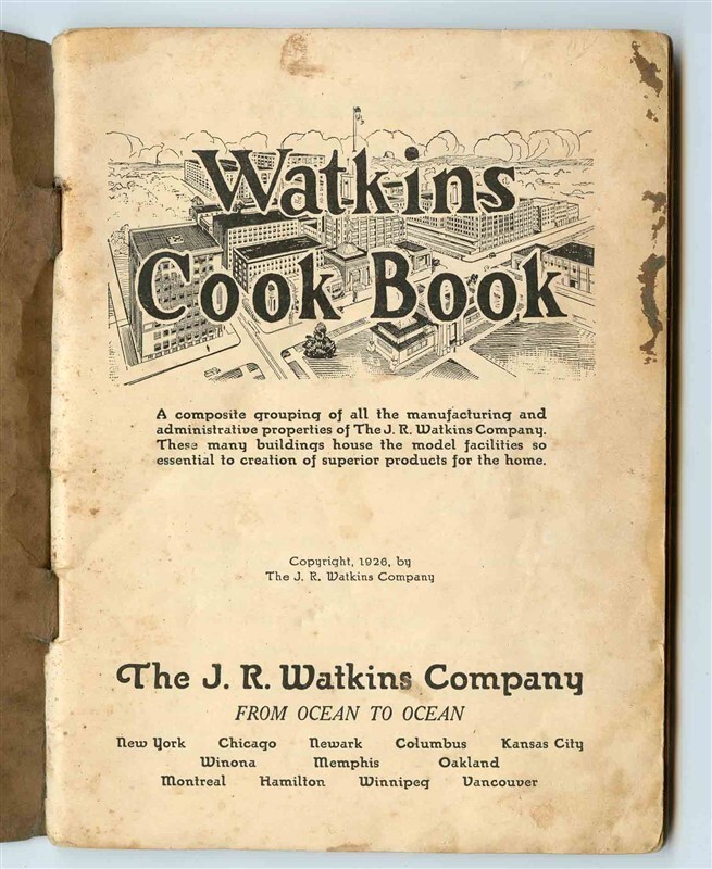 A 64 page card cover cook book with many color illustrations. A very early version of this cook book from Watkins Products. Watkins Cook Book1926 J R Watkins Company From Ocean to Ocean