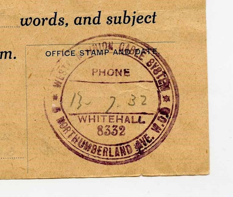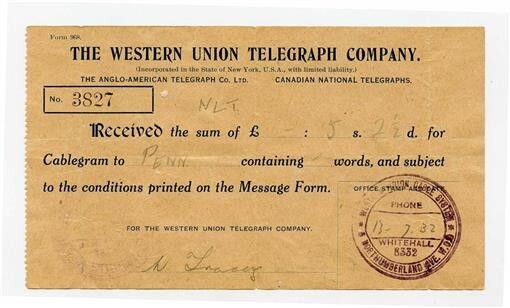 1932 Western Union Telegraph Company Receipt Cablegram from London