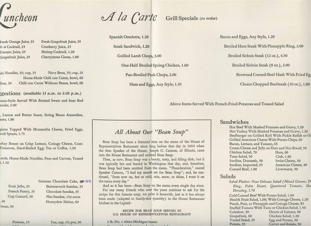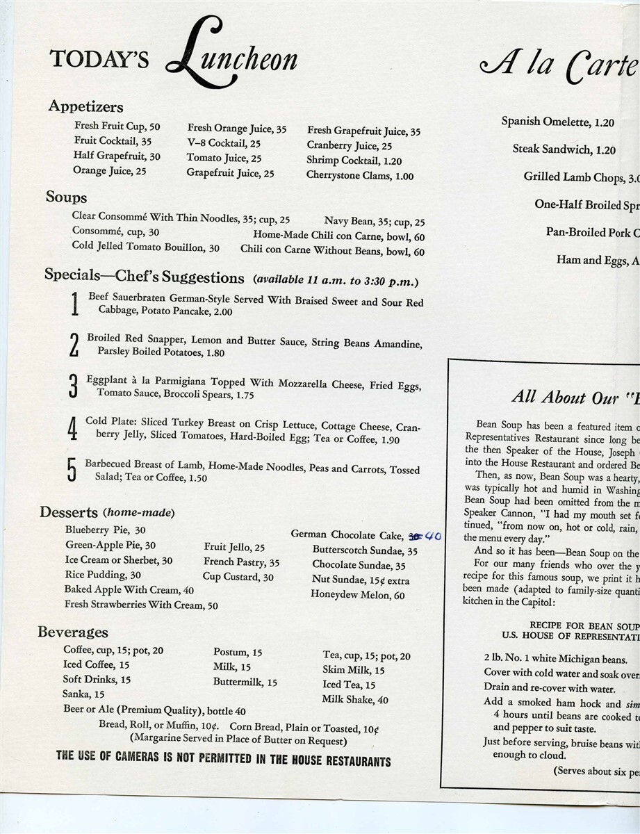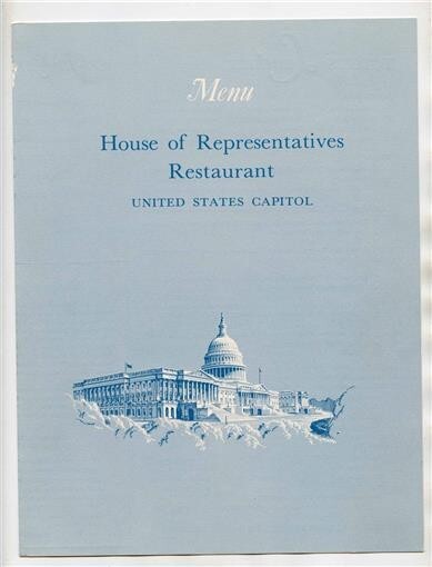 A large 4 page Luncheon menu dated May 1. 1969. House of Representatives Restaurant Menu , located in the United States Capitol . HAs the recipe and All About our"Bean Soup". Measures about 8"x 101/2" when closed. HAs Cornwallis Sues For Cessation of Hostilities Under the Flag of Truce and history of the Fresco on the back cover.