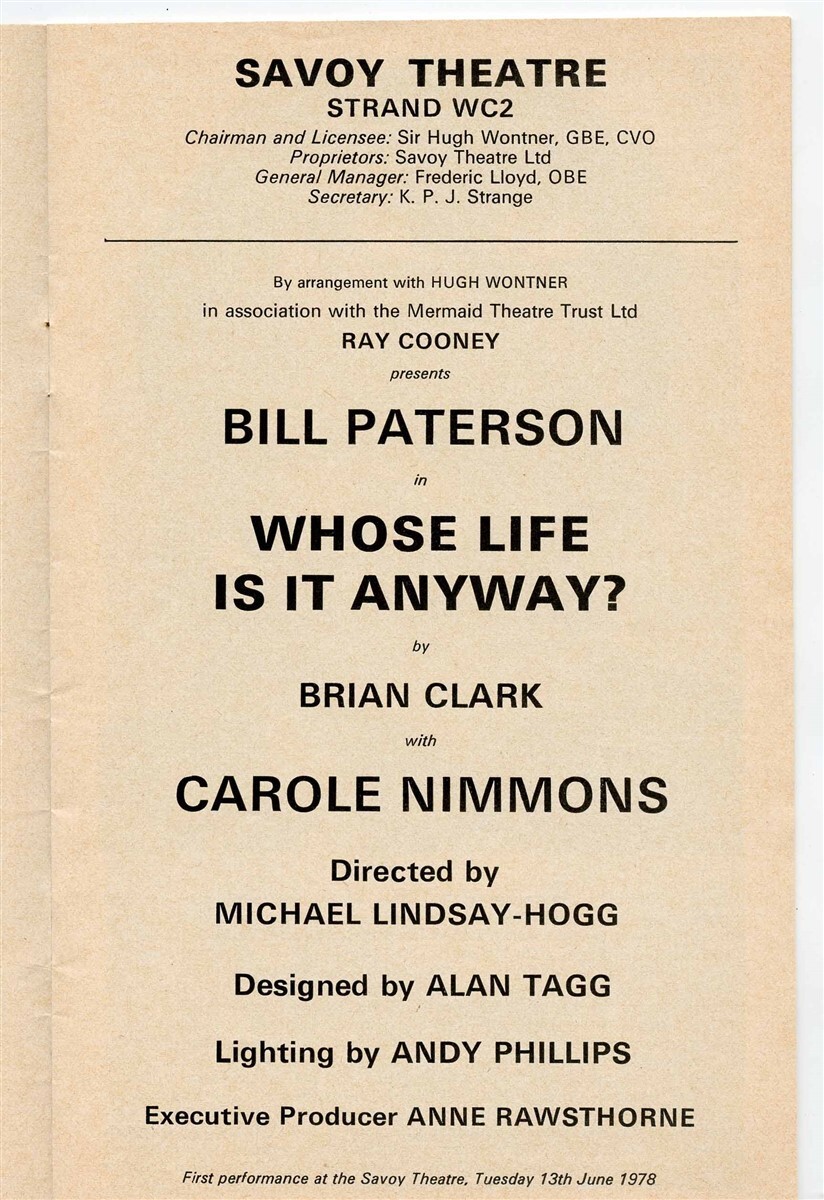 Whose Life Is It Anyway? Savoy Theatre London 1979 Bill Patterson Carole Nimmons