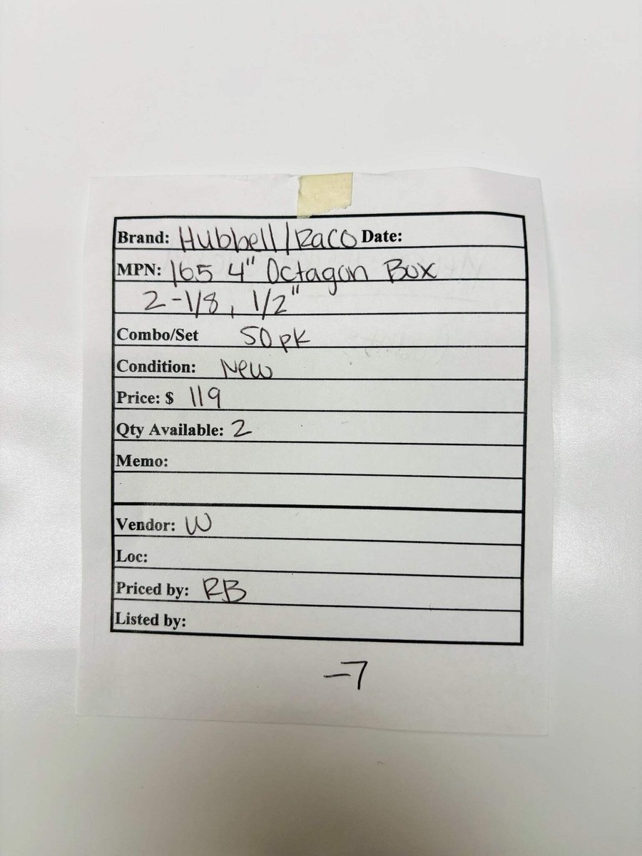 50 Pk Hubbell 165 4-Inch x 2-1/8-Inch Steel Octagon Electrical Box New Hubbell 165 4" Octagon Box is a drawn steel electrical box used for ceiling or wall lighting fixtures or as a junction box. It has multiple 1/2 inch knockouts for conduit or cable entry and provides space to make electrical connections. The box meets UL standards and is sized to support fixtures and covers in residential and commercial installations. Listed by: Renee (Sales Team) ?happiness often sneaks in through a door that you didn?t know you left open? John Barrymore (A positive moment brought to you by Help Resale) About Us Welcome to Help Resale, your go-to consignment shop where value meets quality. At Help Resale, we're dedicated to providing you with an exceptional shopping experience, whether you're looking to find the best deals or consign your items. Need to buy a product, but don't see it in our store? Please feel free to reach out to us and we will help you find it! Help Resale 7200 Fair Oaks Blvd Suite 120 Carmichael CA 95608 Business Hours: Monday-Friday: 9:00 am to 5:00 pm (PST) All product and company names are trademarks TM or registered trademarks of their respective holders. Use of them does not imply any affiliation with or endorsement by them.