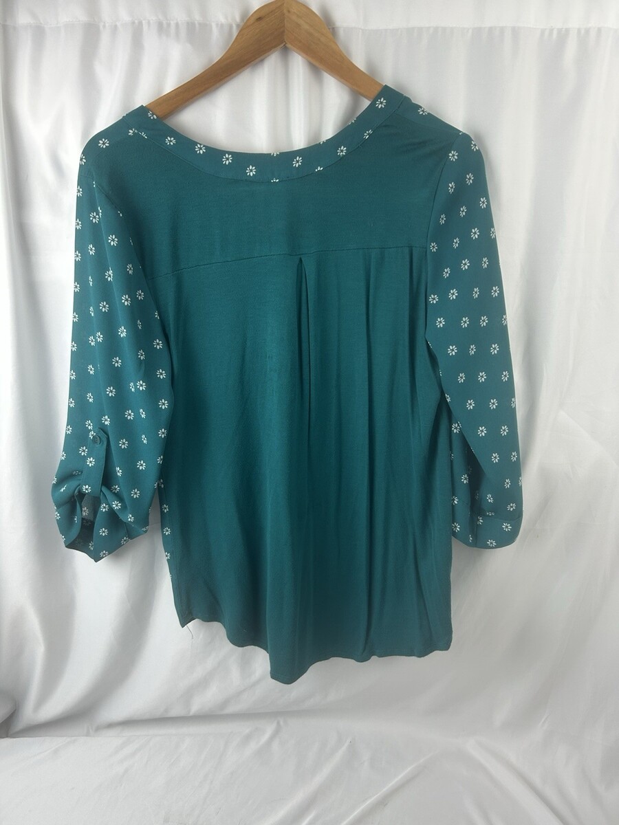 Fortune + Ivy S Teal Daisy Print Mixed Media Blouse Roll Tab Sleeves Back Pleat