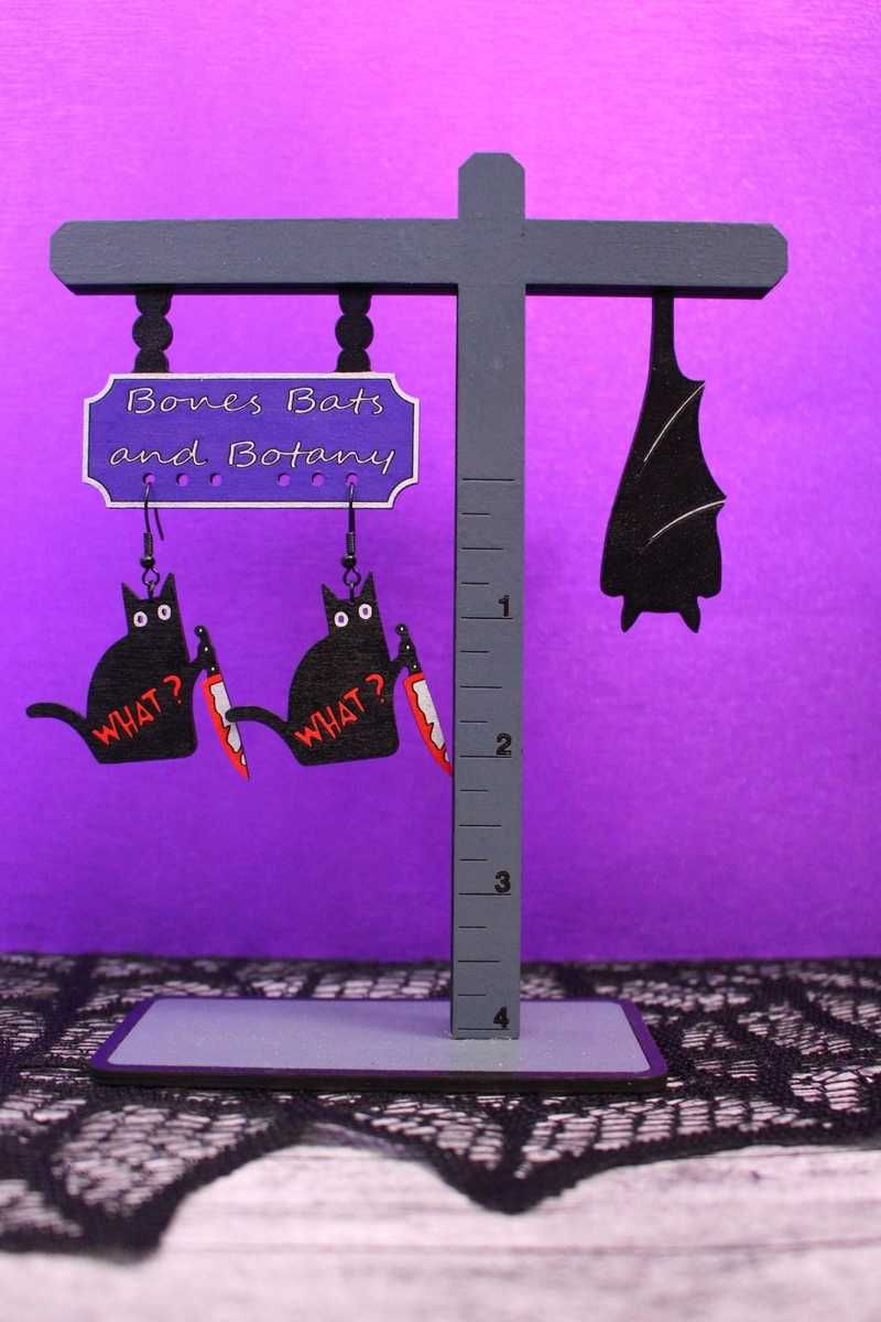 What? Black Cat Earrings, Bloody Knife Dangle, Macabre Halloween Accessory