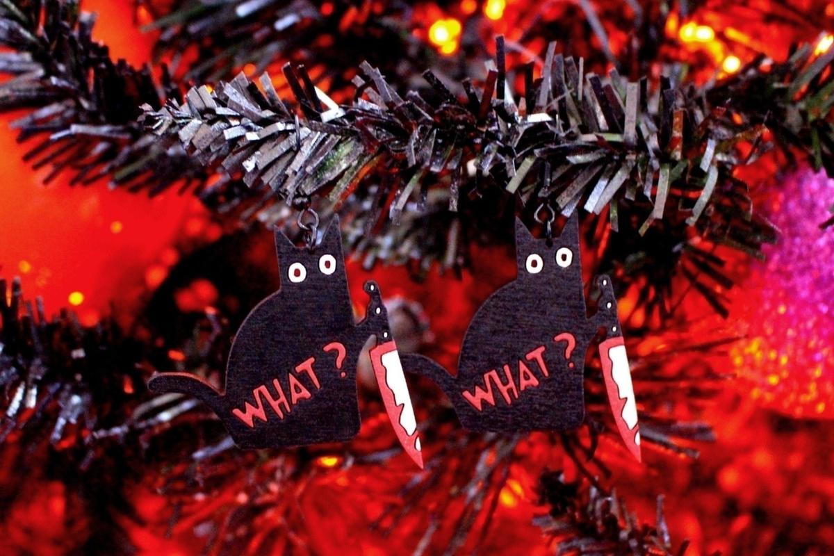 Introducing our What? Cat with Bloody Knife Earrings - the purr-fect accessory for those with a dark sense of humor. Unleash your inner feline with our captivating creation—a bold fusion of intrigue, charm, and humor that will redefine your accessory game. These Black Cat earrings, with eyes that seem to hold a world of mystery, and paws that hold a detailed Bloody Knife are striking yet graceful, evoking the perfect balance of daring and fun. Despite their stunning visual impact, the earrings are incredibly lightweight, ensuring all-day comfort without compromising on style. Each piece is a reflection of meticulous craftsmanship, making them not only an accessory but a statement. Wear them to an evening gathering or a casual outing and watch as they become the centerpiece of conversations. Perfect for Christmas or Birthdays. With the What Cat Earrings, step into a realm where curiosity meets fun, one enchanting accessory at a time.
