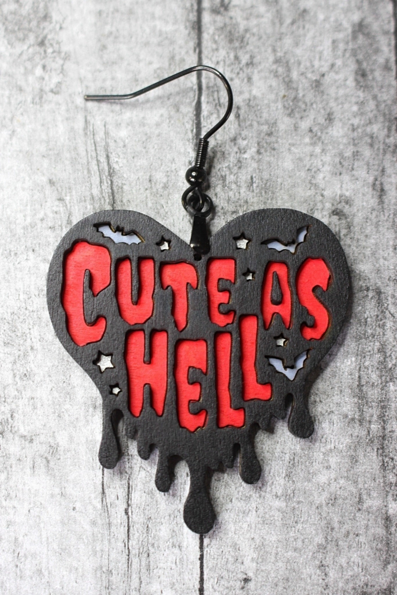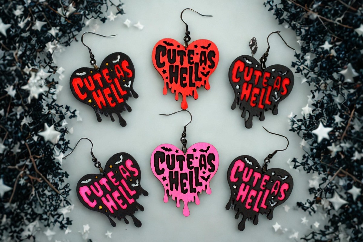 Cute as Hell Heart Shaped Earrings, Pink and Red Horror Jewelry, Spooky For Her