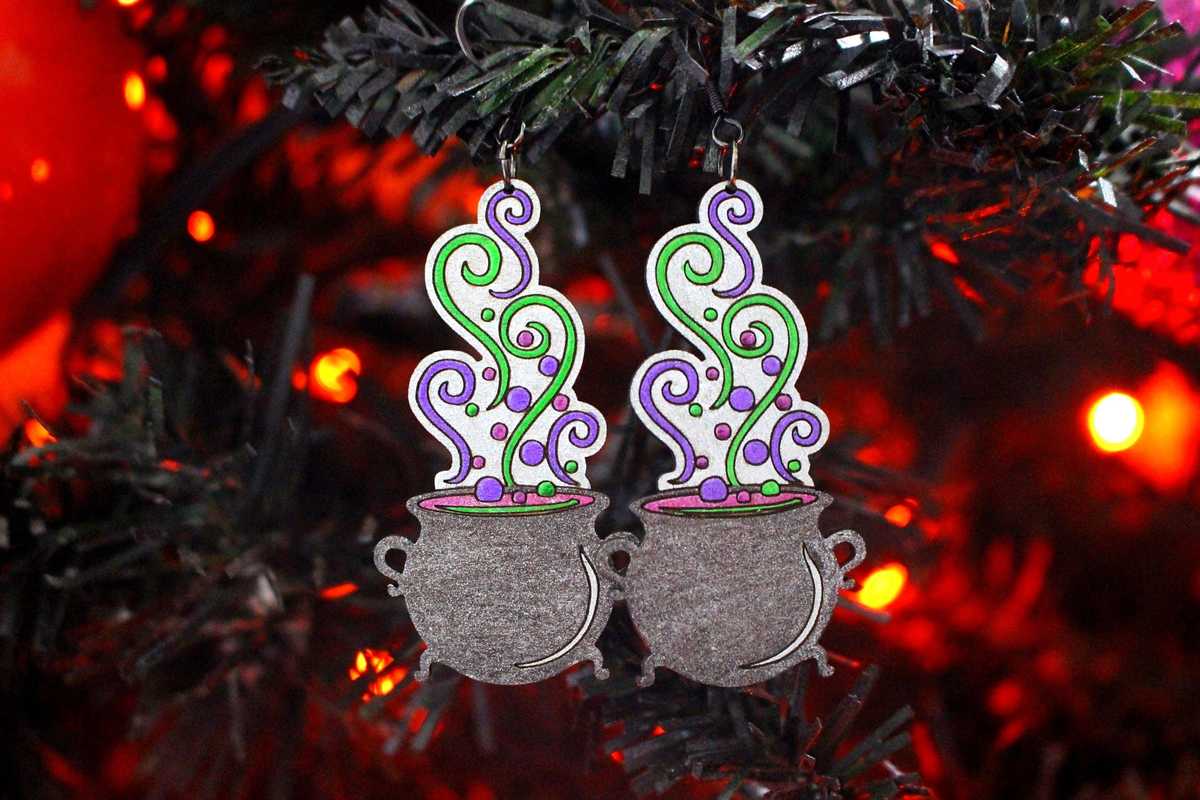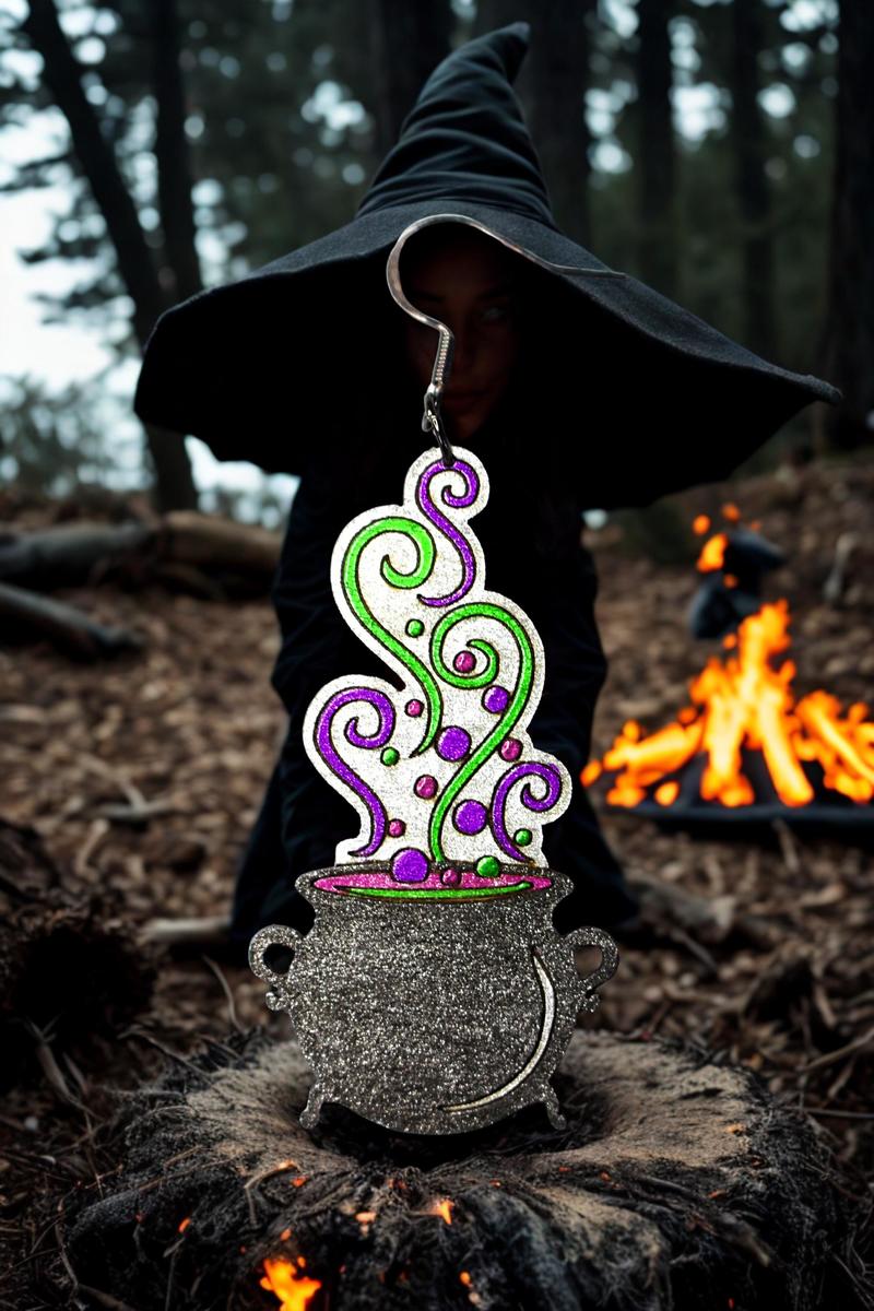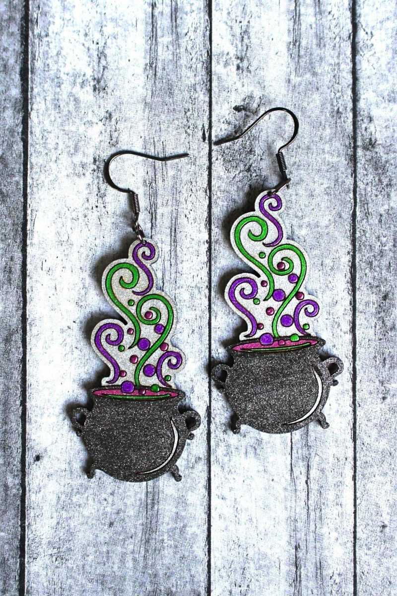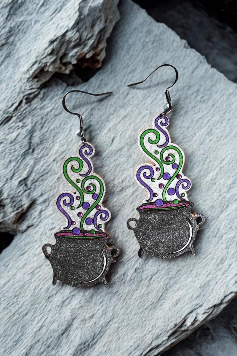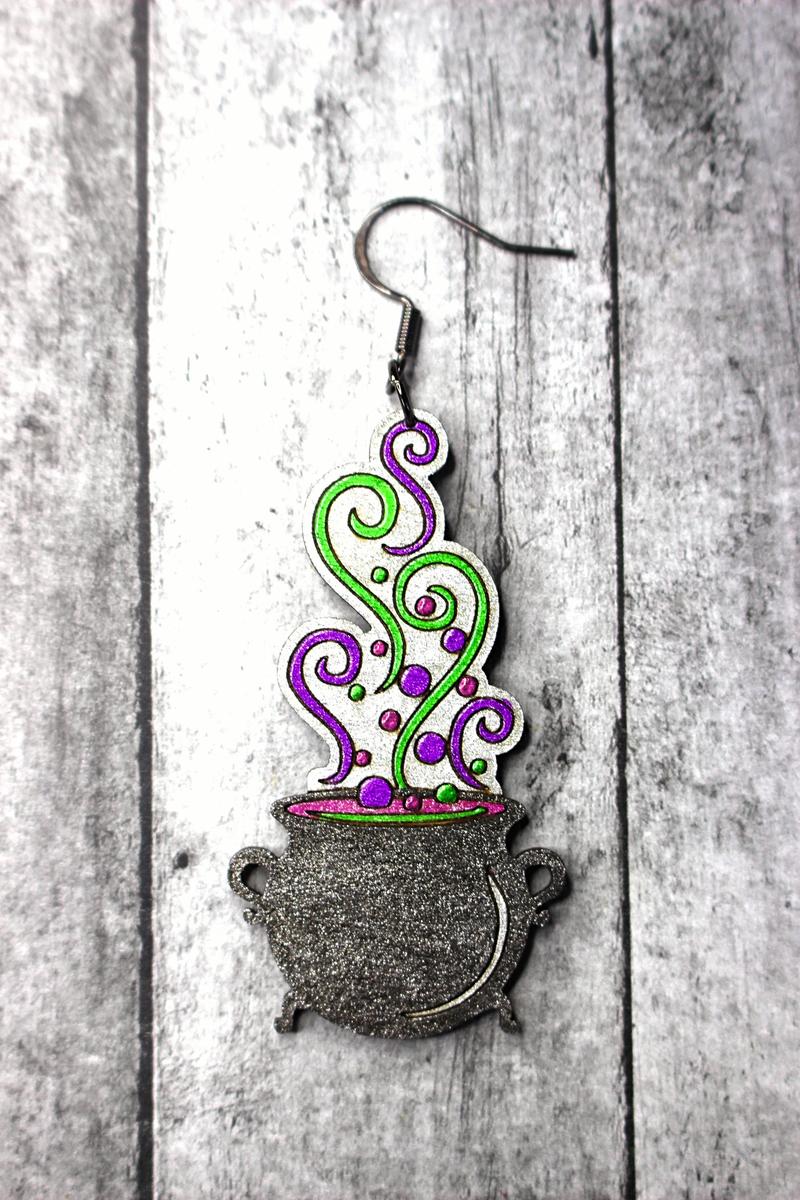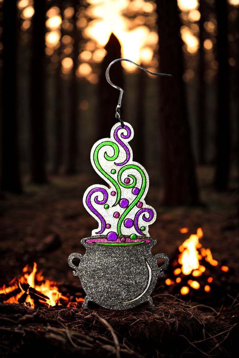 Witches Cauldron Glittery Earrings, Halloween Jewelry, Spooky Horror Theme