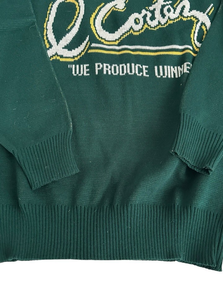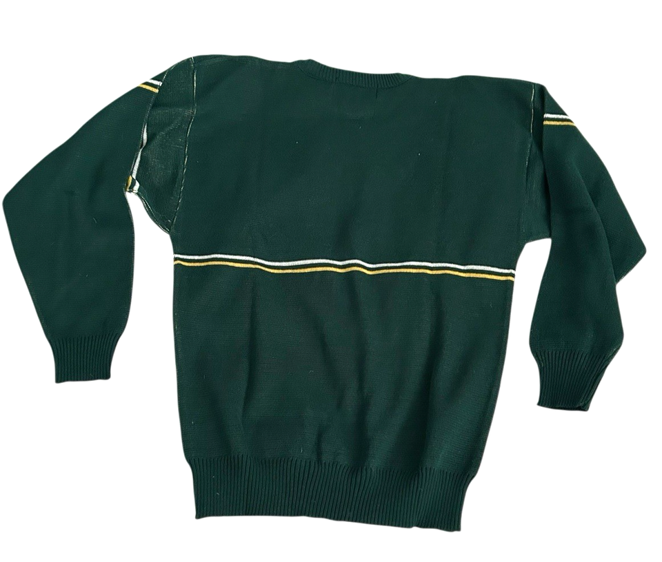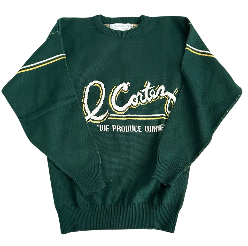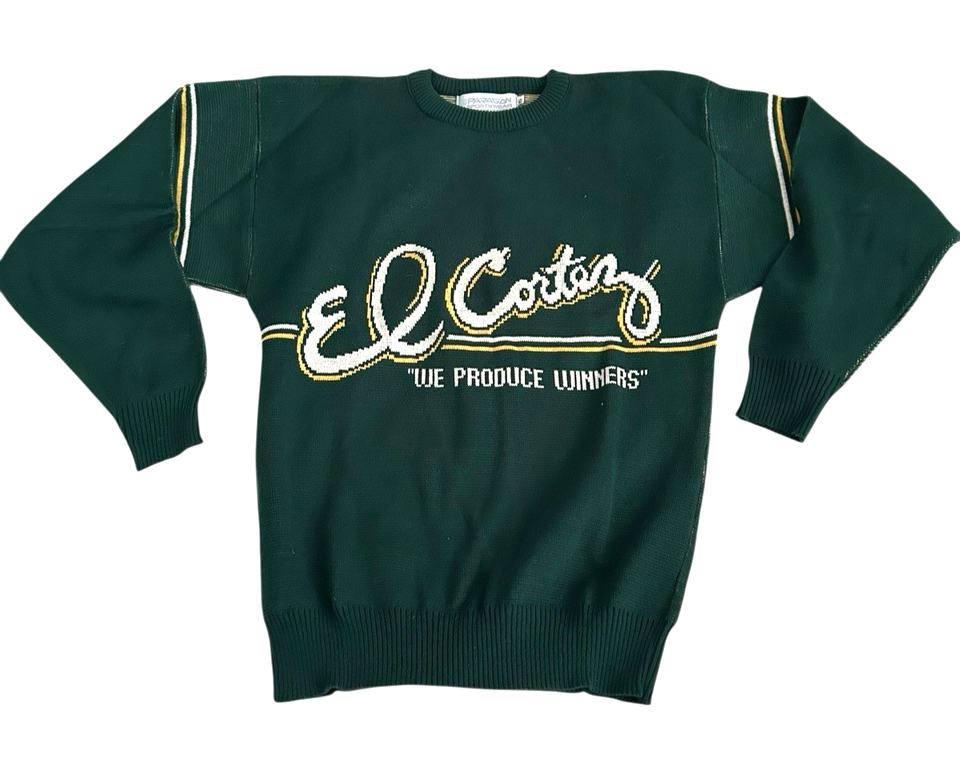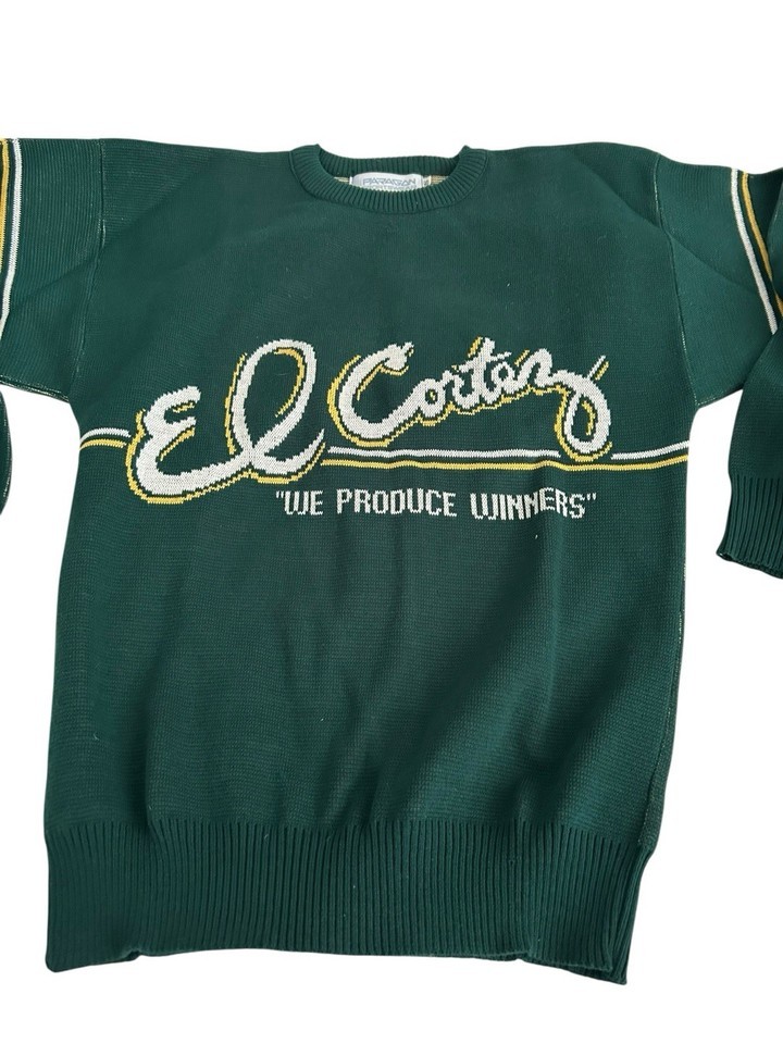 The product is a vintage 1980s El Cortez green small sweater by Paragon Sportswear, featuring a classic crewneck design. This original piece of men's vintage clothing is perfect for casual occasions and showcases a retro letterman look. Made in the USA, this sweater is a unique addition to any wardrobe for those looking to add a touch of specialty to their outfit. The tag says SX. See measurements in photos.