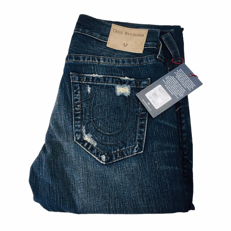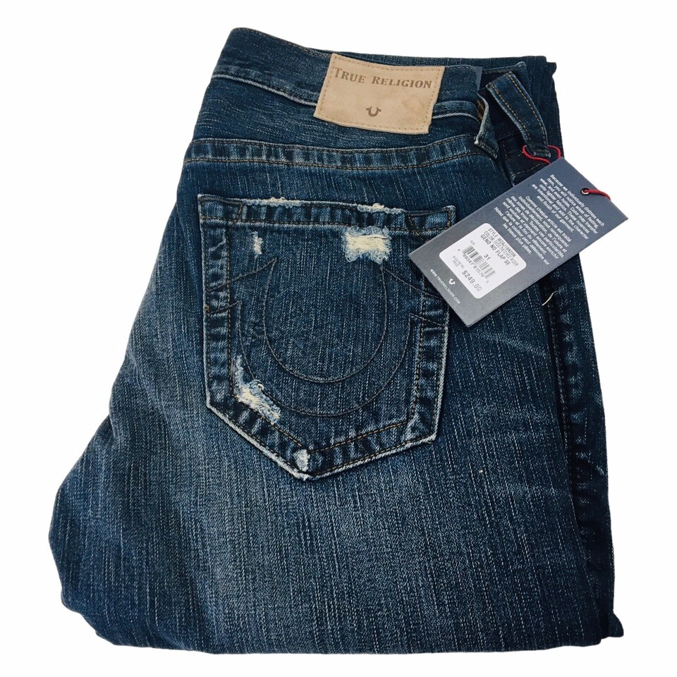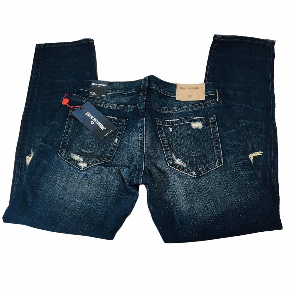 Step up your denim game with these stylish and brand new True Religion Jeans in a flattering Geno Relaxed Slim Fit. The medium wash and distressed theme provide a vintage look while the stretch feature ensures comfort. The denim fabric is of high quality.