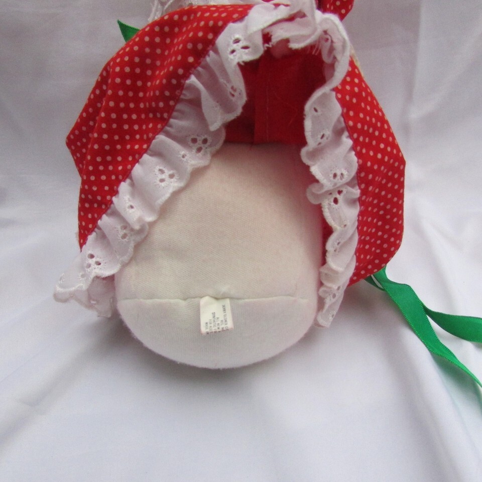-no holes or rips but some of the red from her dress has rubbed off as pink on her one hand and to her cloth body under her dress (not visible unless you lift her dress). Soft cotton face/hands/ body.