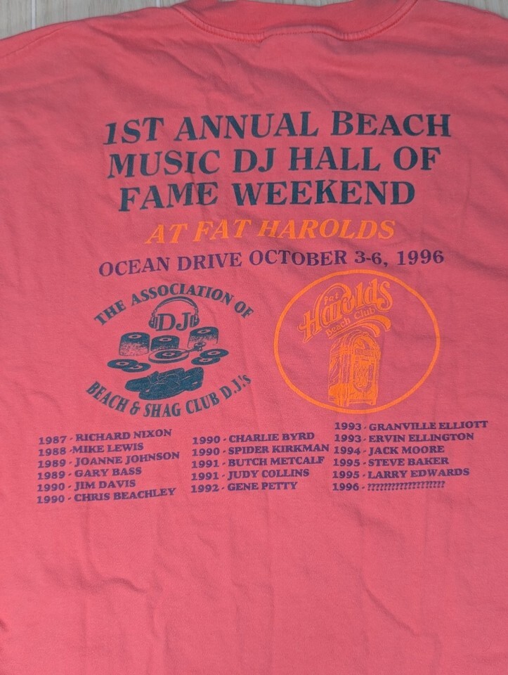 Featuring a unique embroidered patch on the front left chest highlighting the "Beach Music DJ Hall of Fame," this tee carries a nostalgic charm. The back displays detailed screen printing commemorating the 1st Annual Beach Music DJ Hall of Fame Weekend at Fat Harolds, dated October 3-6, 1996, along with names of notable DJs. This vintage design makes it a perfect collector's item or a conversation starter for music enthusiasts.