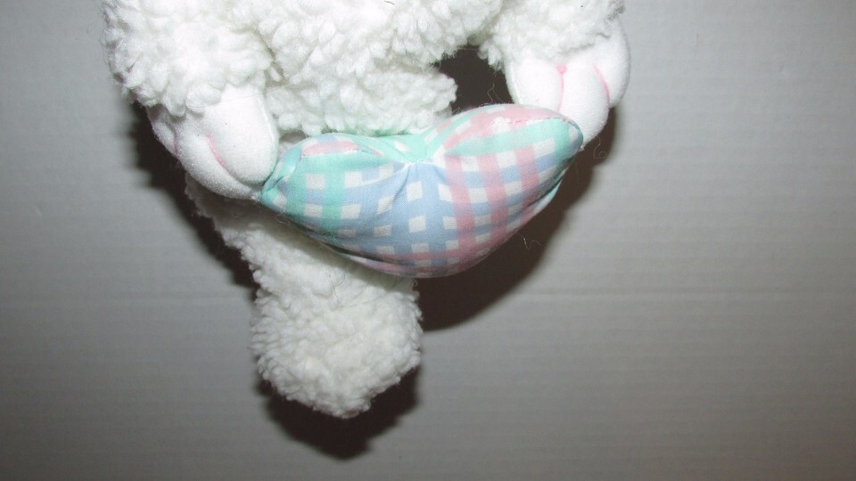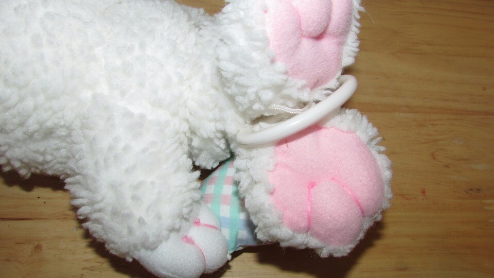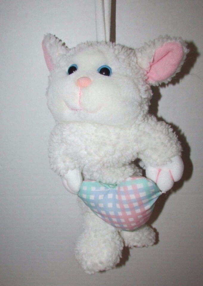Vintage plush lamb baby sheep pink ears plaid heart musical hanging crib toy