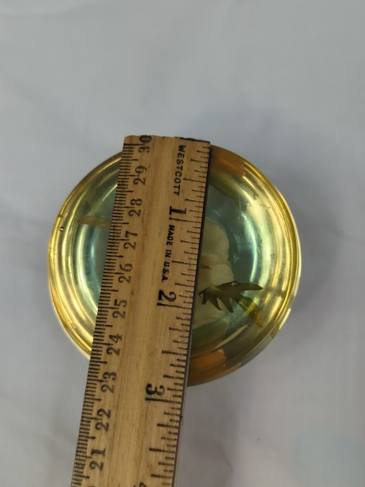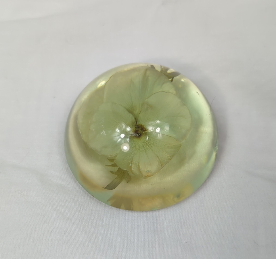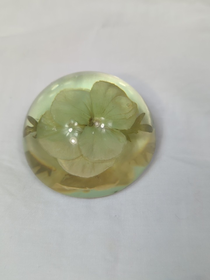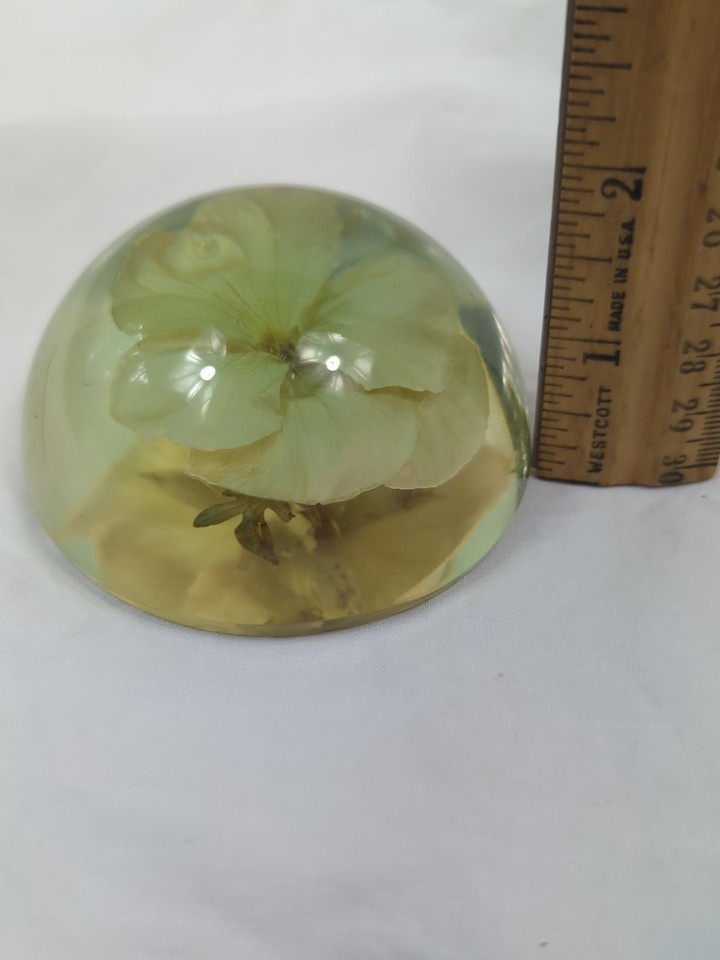 W. Rolfe Vintage MCM Half sphere dried pansy flower paper weight Acrylic Lucite