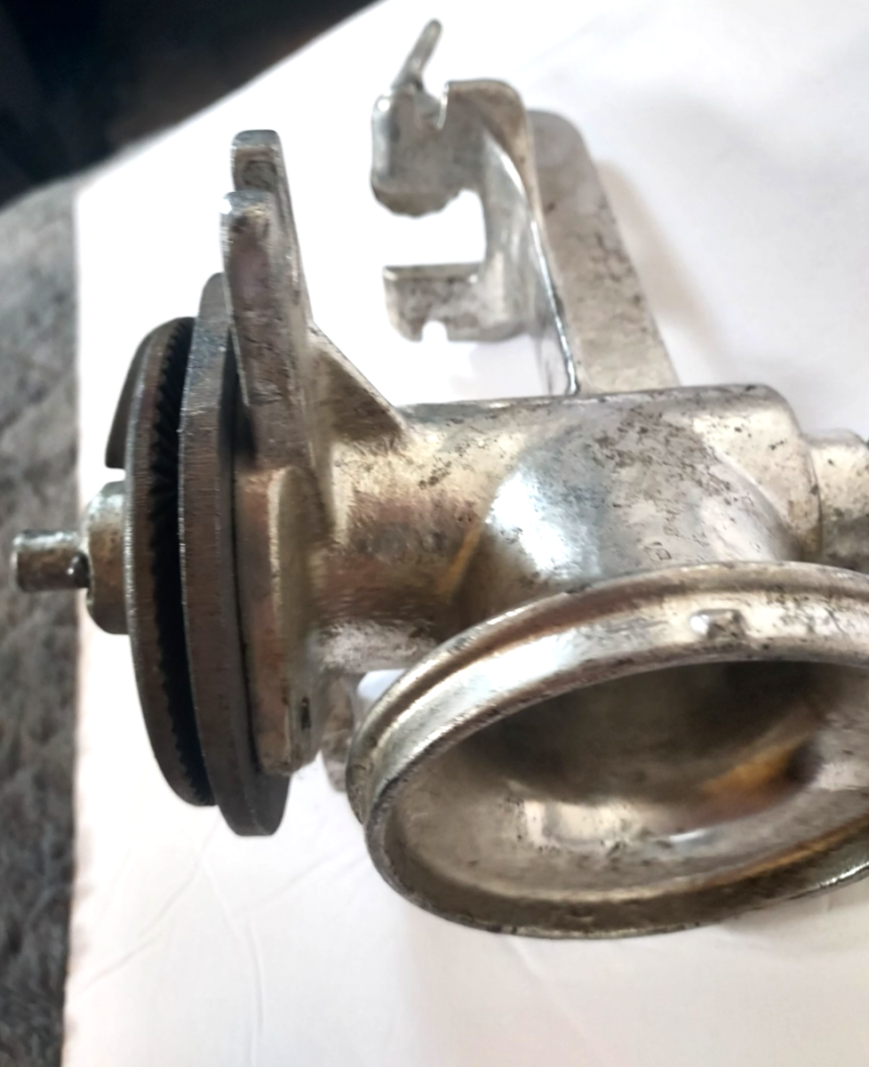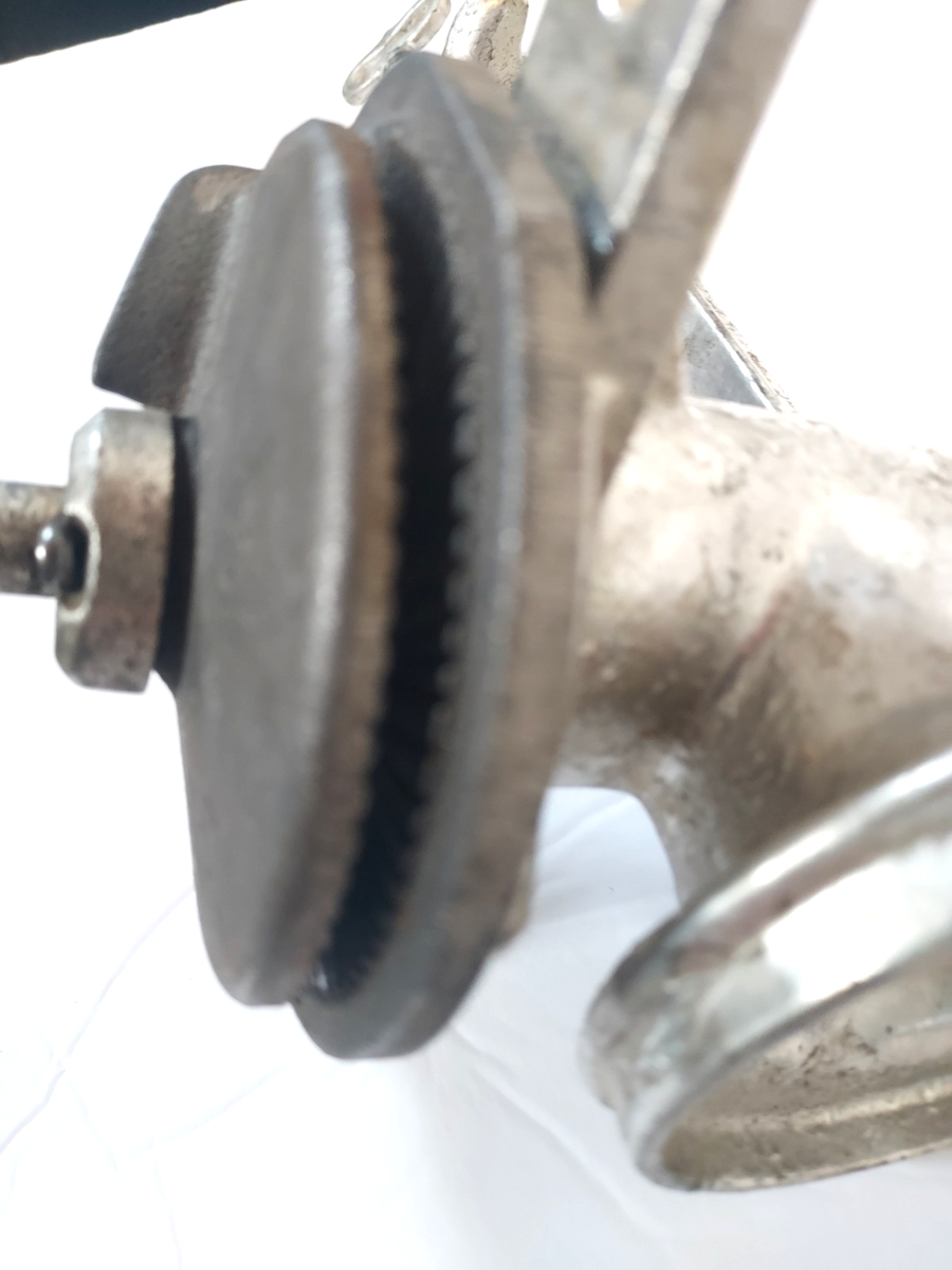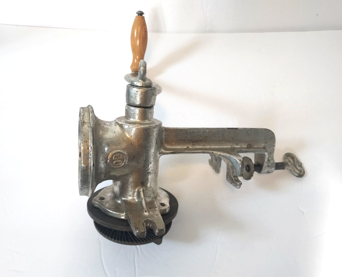 A great cast iron hand crank vintage tabletop 'OB' juicer grinder... with a wooden handle! In good condition!