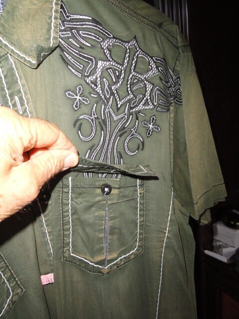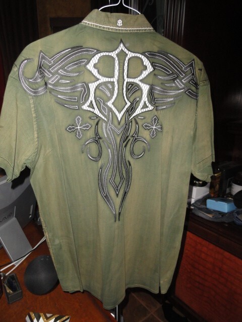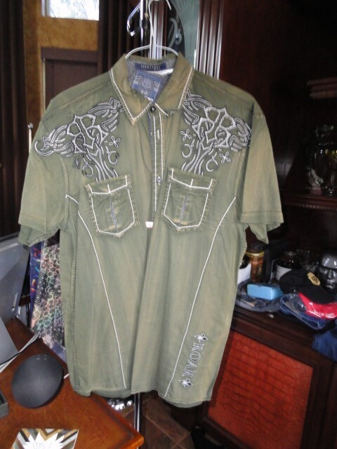This is a Roar Signature Edition Khaki Short Sleeve Large size Adult shirt. Has embroidered design front and back. Good condition. Hardly worn. No missing buttons or issues. Fresh Laundered. We Ship Worldwide fully insured.