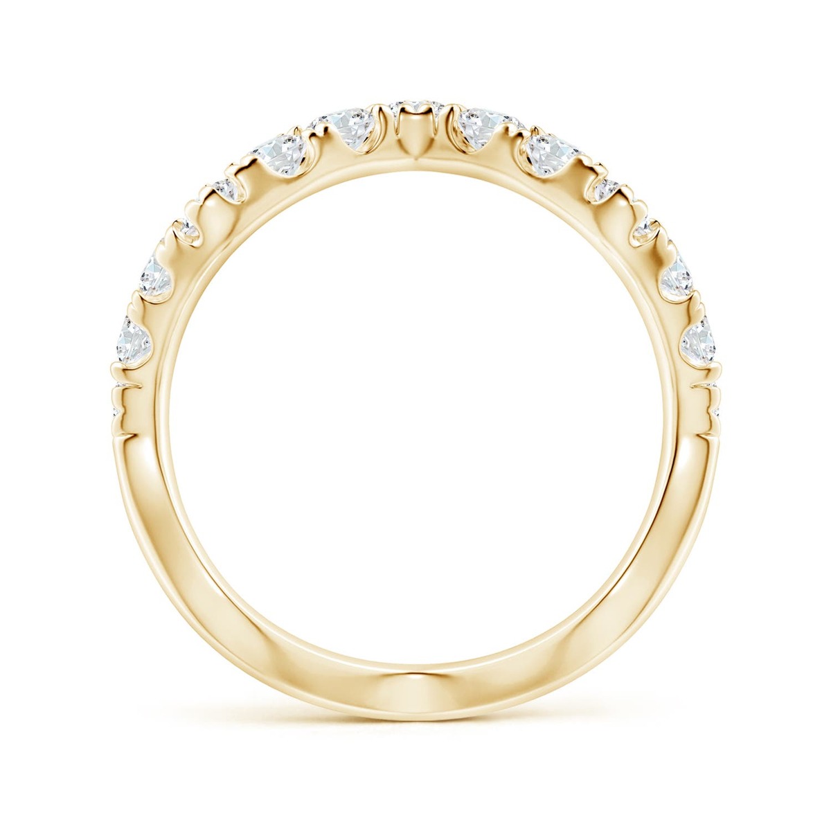 This classic half eternity diamond band is designed in 14k solid gold with a modern twist. It features a striking zig zag pattern and is encrusted with sparkling diamonds in an intricate U pave setting. The exquisite zig zag pattern and the brilliance of the diamonds give this band a distinct look.