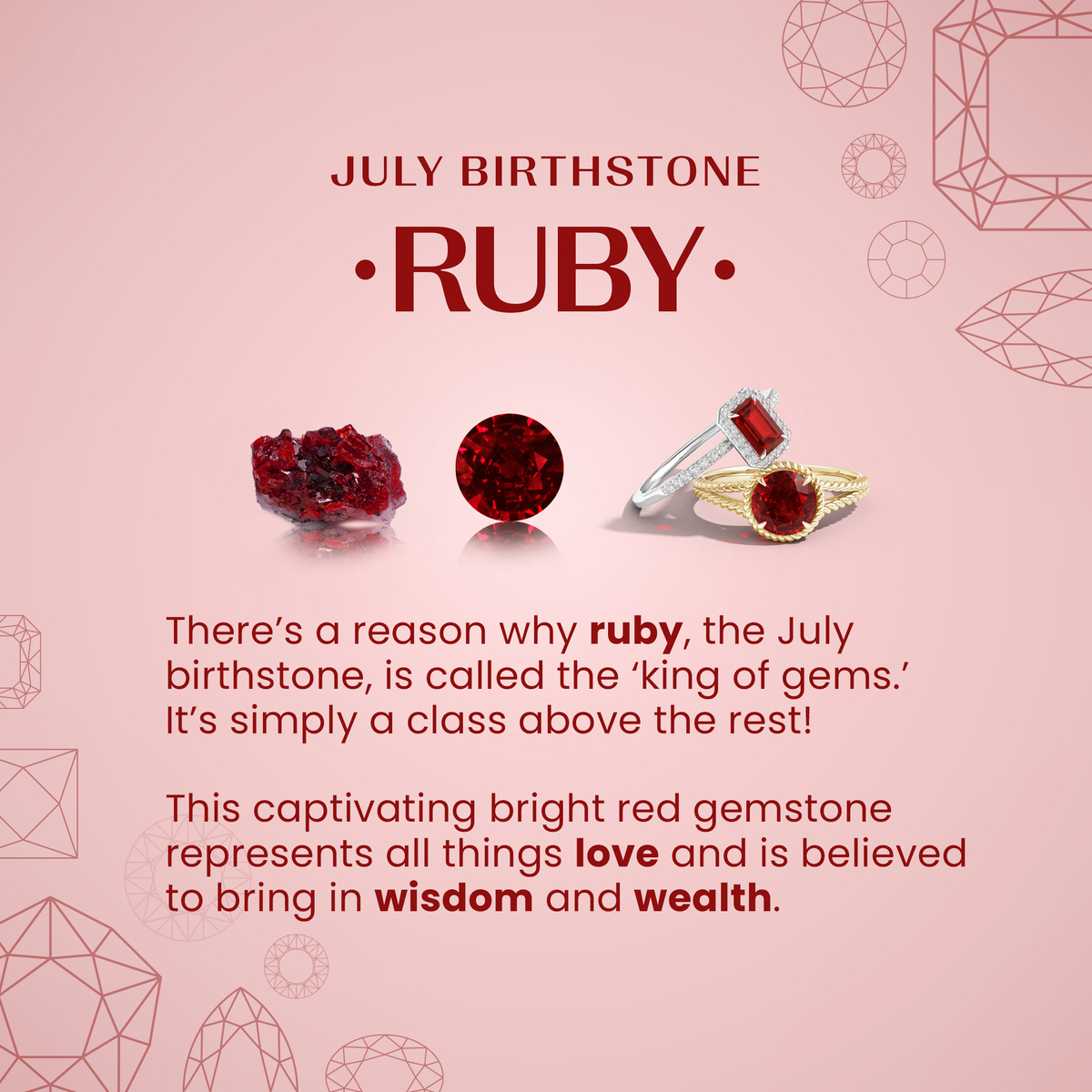 Ruby, the July birthstone and a classic gift for 15th 40th anniversaries, stuns with its rich red hue?a bold symbol of love, passion, and timeless elegance. Ruby is a favorite in fine jewelry pieces such as Ruby ring, Ruby earrings, and Ruby pendant.