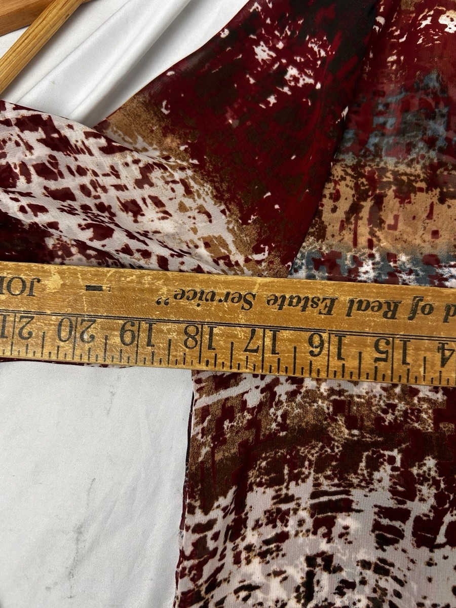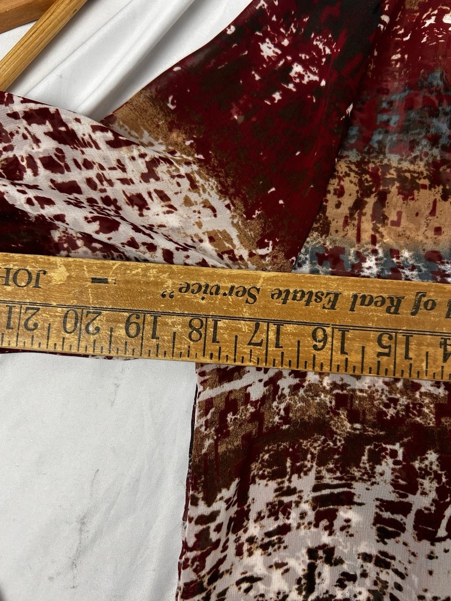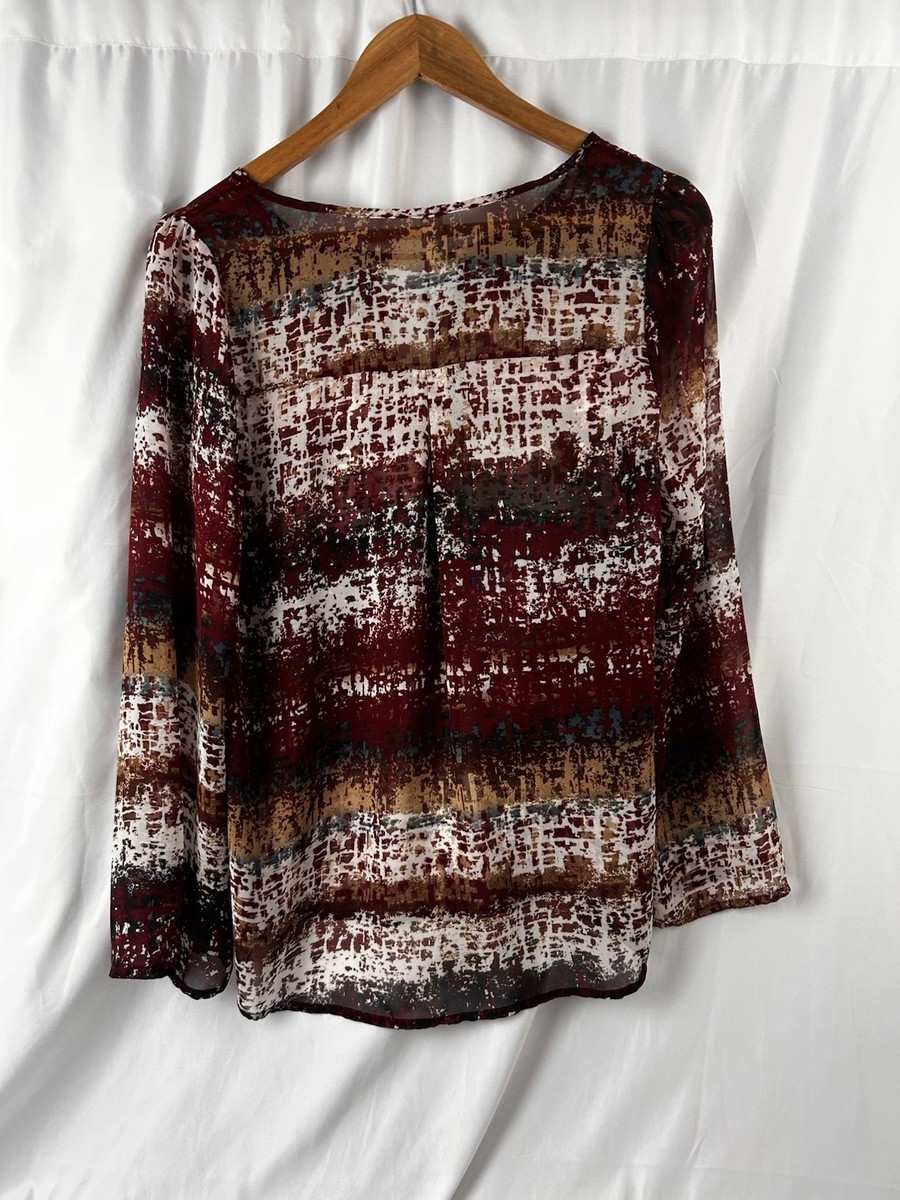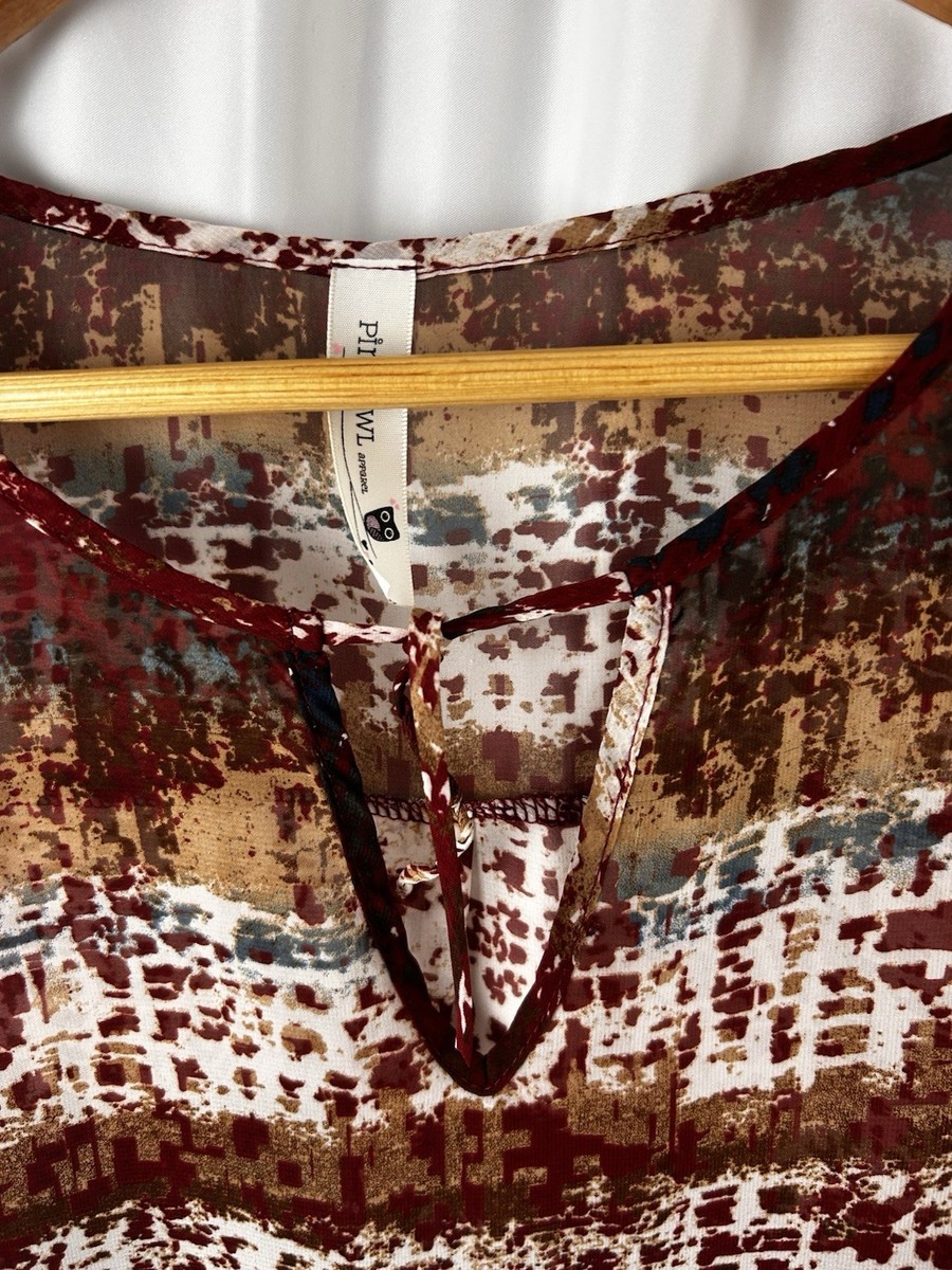 Pink Owl apparel women?s blouse/top in a lightweight sheer woven fabric (chiffon-like feel). Beautiful abstract/brushstroke stripe print in burgundy/wine, cream, tan/camel with hints of teal/blue.
