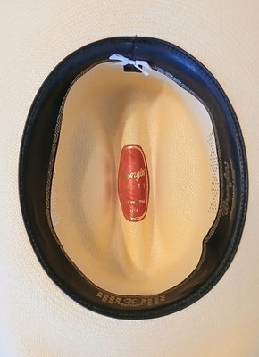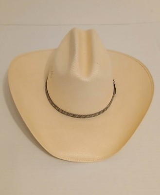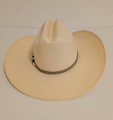 This is a Vintage Wrangler 20X Genuine Shantung Panama Western Cowboy Hat. The size is shown in one of the photos. There are some minor brown spots on the back of the hat as shown in the last photo but other than this it is in very good shape. This is a classic piece of men's workwear, perfect for summer and spring occasions. Made in Texas with Genuine Shantung Panama straw. Let me know if you have any questions. Thankyou for looking.