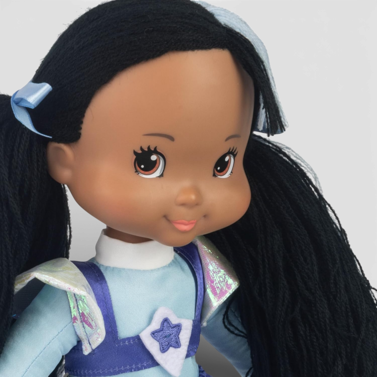 She features a soft, huggable body with a detailed vinyl head and rooted hair (complete with her signature blue stripe). Dressed in her iconic deep blue and purple outfit with harem-style pants and a star belt.