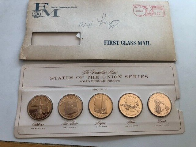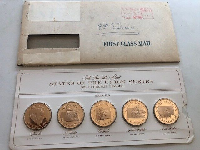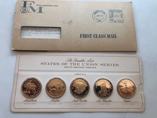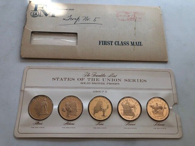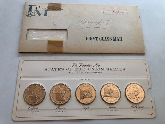 Available for sale is the complete Franklin Mint States of the Union Series Solid Bronze Proofs. Group 1 through 10 - all in the original packaging from the Franklin Mint.