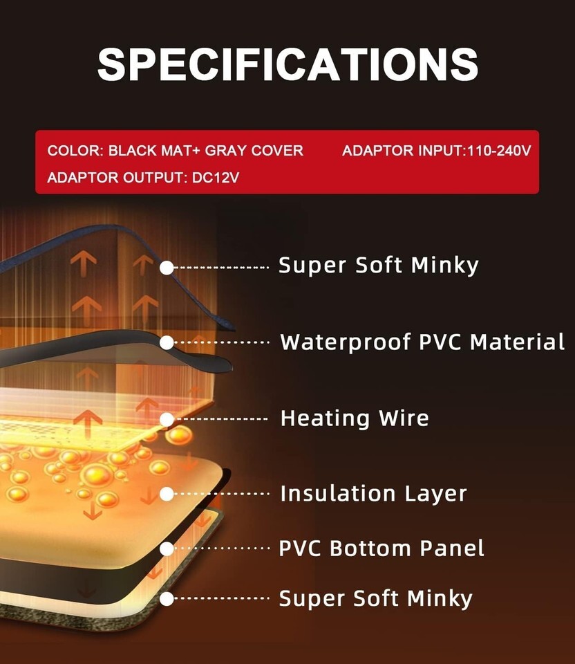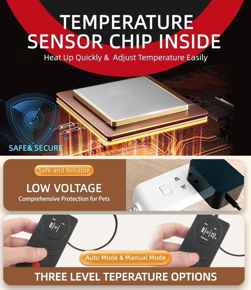 Safe Reliable: To prevent pets from biting the wire and getting electrocuted, the cat dog heating pad is equipped with a low-voltage plug (12V) for extra safety. Besides, the wire is wrapped by a spiral chewy cover. But you?d better take your pet away from the wires when they bite the wires