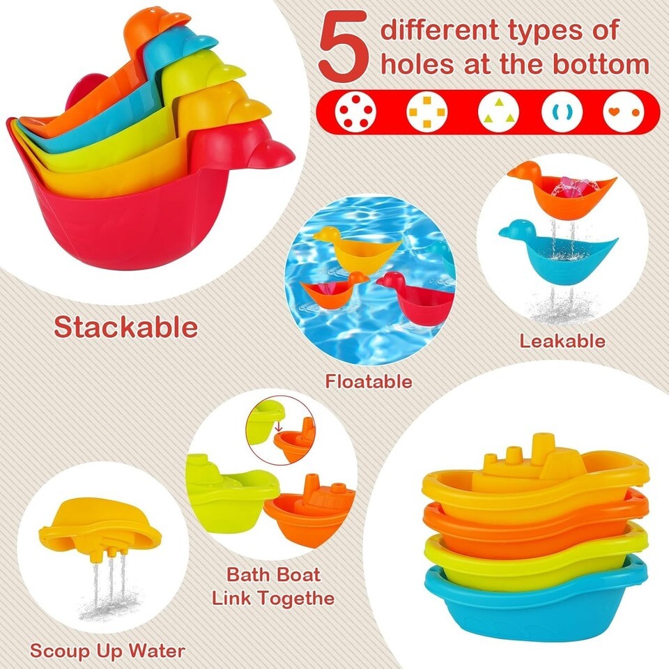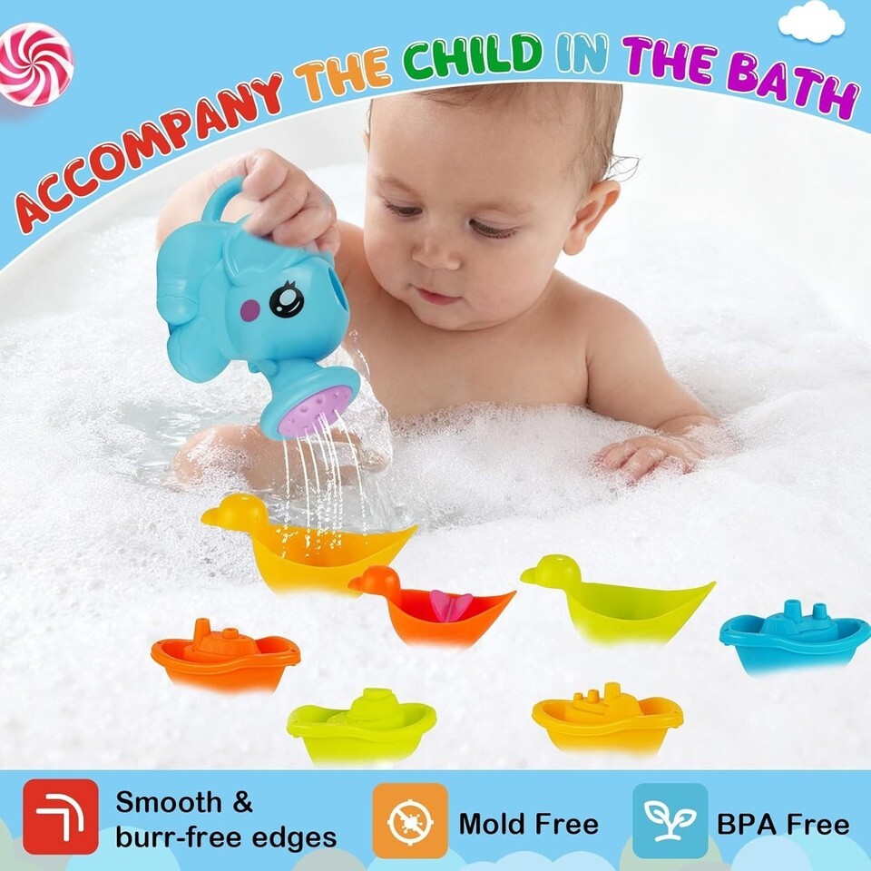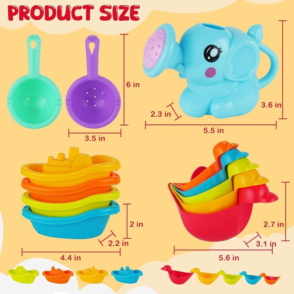 Fun Bath Time: Make bath time an adventure with our delightful Bath Play Set, designed to transform your child's daily routine into a splash of fun! This comprehensive set includes four stackable boats, five adorable ducks, an elephant-shaped watering can, and two perforated spoons. Making Bathtime An Enjoyable Experience For Kids.