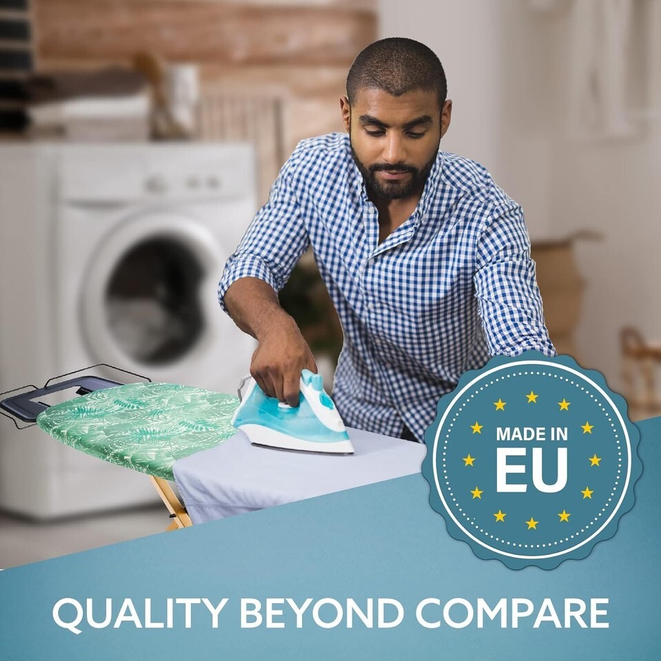 * STURDY - MANUFACTURED IN THE EU - BUILD TO LAST ? , Not like cheap ironing boards this ironing board is build and designed in the EU with European quality, the unit is safe from Wobbling, heavy duty wide legs and big sized board, all designed to safe and help the unit stay still without any moves while in use, protective plastic shield on the legs to safe your floors from scratches, high quality material to keep the lifespan of the unit for years to come !