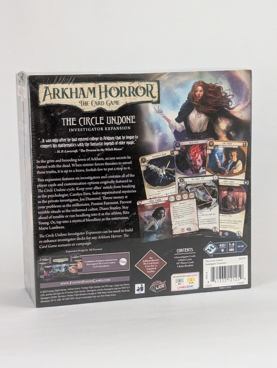 The Circle Undone Investigator Expansion for Arkham Horror: The Card Game features six investigators and contains all of the player cards and customization options featured in the original The Circle Undone cycle of products. Keep your alliesโ minds from breaking as the psychologist, Carolyn Fern. Solve supernatural mysteries as the private investigator, Joe Diamond. Throw money at your problems as the millionaire, preston Fairmont. Prevent terrible rituals as the redeemed cultist, Diana Stanley. Stay ahead of trouble or run headlong into it as the athlete, Rita Young. Or, tap into a mystical bloodline as the entertainer, Marie Lambeau.