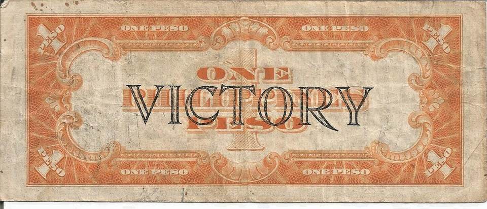 The product is a circulated 1944 Philippines 1 Peso Victory Note. This banknote from the Philippines features a design commemorating victory in World War II. It is a tangible piece of history from the country's past, offering a glimpse into its cultural and monetary landscape during that time. This collectible item is perfect for numismatists or history enthusiasts interested in exploring the unique heritage of the Philippines through its paper money. Tape on left side of banknote, ink marks on back of note