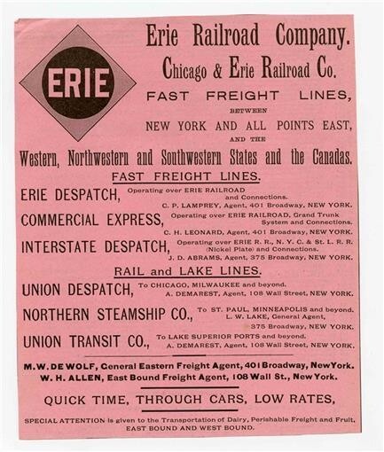 An Original 1890's Railroad Ad.Original 1890's Erie Railroad and Chicago Erie Railroad Ad Fast Freight Lines from a Transportation Publication. This ad highlights The Fast Freight Lines and Rail and Lake Lines. To New York and All Points East. Measures about 6" x 7 1/4".