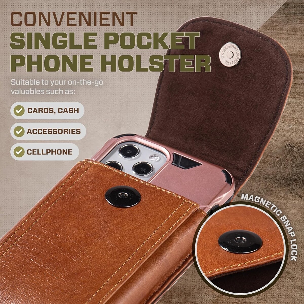 Pocket: This cellphone belt holster is designed with deep pocket storage to prevent the mobile phone from coming out. It is a close-packed carrier to quickly access the essentials. Installed with a snap magnetic lock that completely closes without snuggling the essentials in