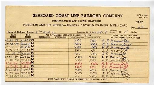 Seaboard Coast Line Railroad Co. Inspection & Test Record Highway Crossing 1979