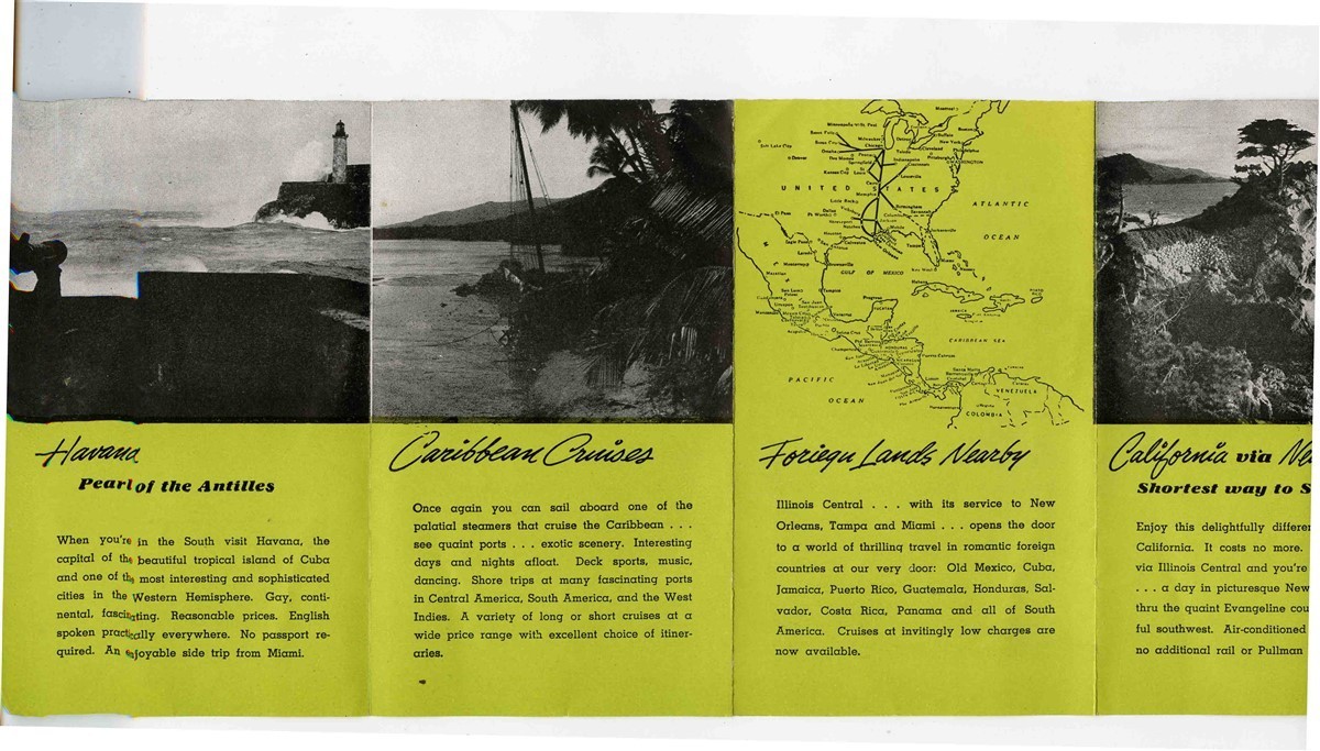 A 12 panel fold out brochure with route map, destination photos and information, name train information and more. Illinois Central Railroad Main Line of Mid America Brochure Everywhere South