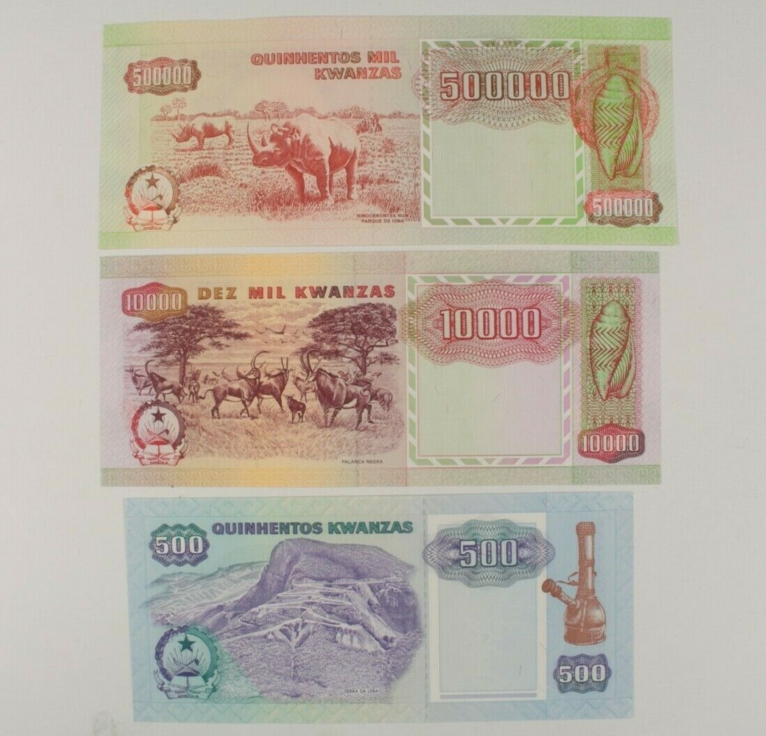 1991 Angola 3-Notes Currency Set 500 10,000 500,000 Kwanza Fior di Conio