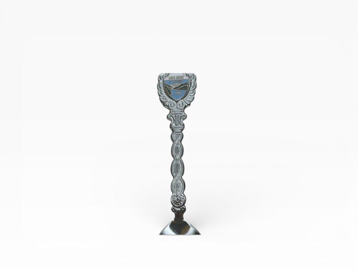 This collectible souvenir spoon features intricate detailing and a crest emblem representing Lake Louise, Canada. A beautiful keepsake or decorative item.