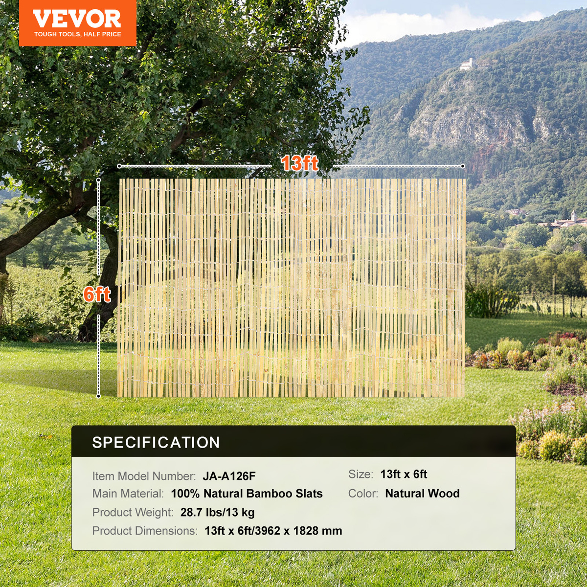 VEVOR Natural Bamboo Fence Privacy Screen, Eco-Friendly Bamboo Slat Fence 6'x13'