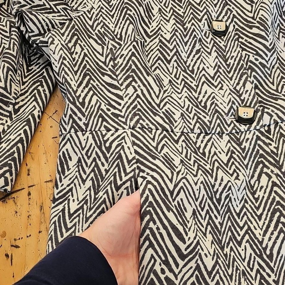 Early 2000s ponte knit longline jacket in a black and white chevron pattern with structured seaming, on-seam pockets, and statement buttons. Smooth stretch feel that layers well over trousers, denim, or simple basics for a clean Y2K-era look.