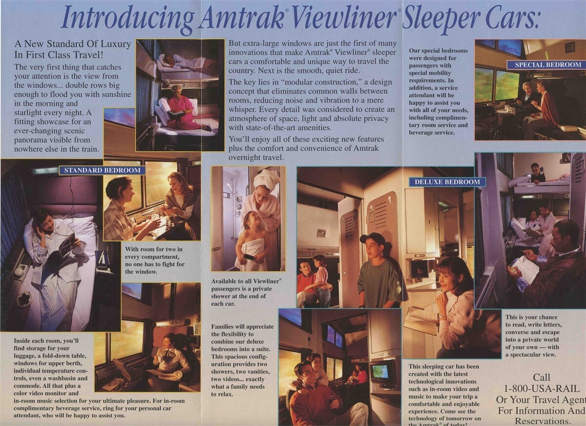 A full color 6 panel fold out brochure. Freat photos and information. Amtrak Viewliner Sleeper Cars Brochure.