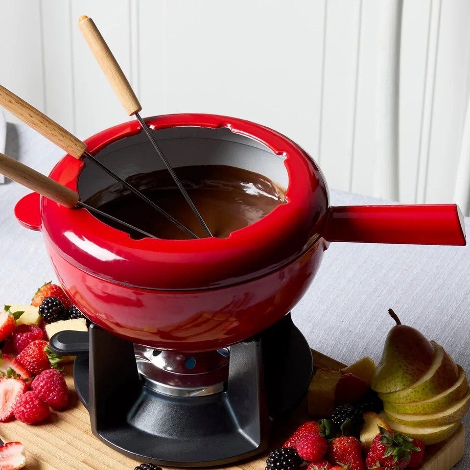 Fondue set is for classic melted cheese or chocolate dips, for quick cooking meat at the table, and more