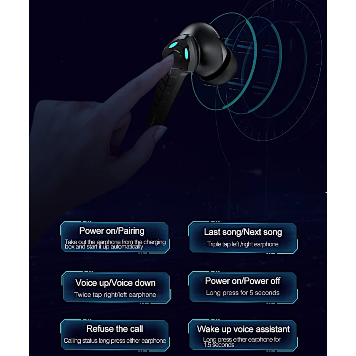 LED Eyes Cobra Design Wireless Bluetooth 5.3 Earphones Touch Control HD Headset
