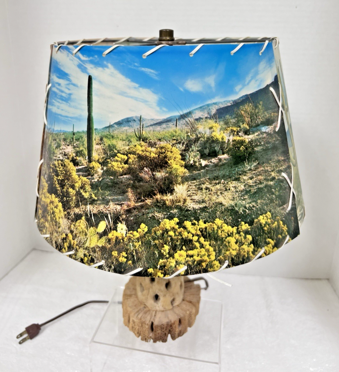 Dried Cholla Cactus Wood Table Lamp Laced Desert Landscape Parchment Lampshade Folk Art. Laced parchment cactus shrubs desert scene lampshade on cholla cactus wood lamp measures approx. 15" tall with shade and is in very good condition, works, do damage, holes, dents, etc. in the parchment lampshade I find, a little dirtiness. See pictures. We will need to ship the shade in its own box