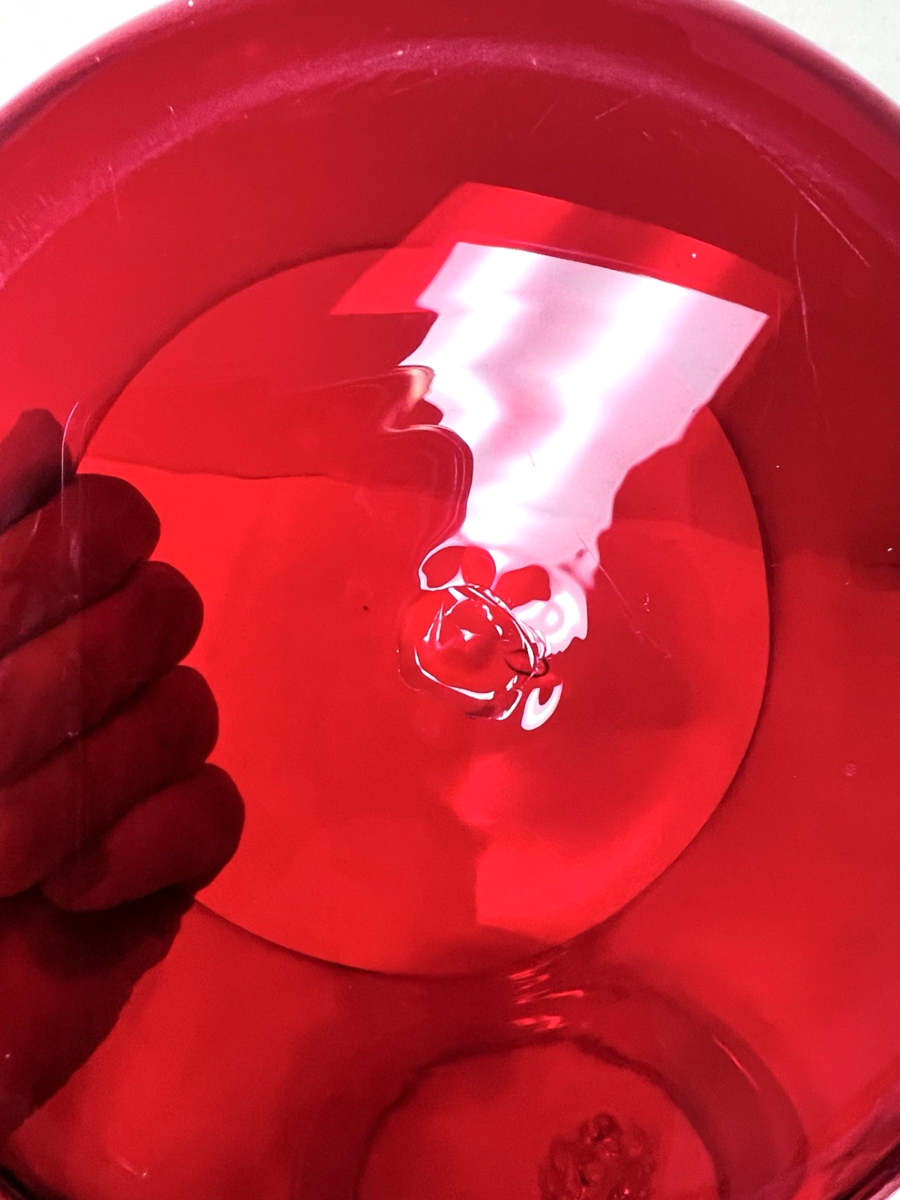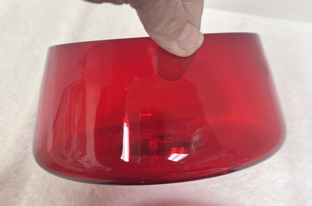 Italian Murano Glass Ruby Red Candy Clear Grape Gold Flecks Handle Mouth Blown The color is a stunning clear red no chips flakes or breaks HOWEVER the grapes have a sharp spot on the stem form when they pulled the pontil off it can be buffed off but it's not damage (we have used a black light and a magnifier it's just a tiny piece of extra glass like a tiny point) ... The bottom is 6 1/4 across the height with the lid is also 6 1/4 inches it's a stunning piece of glass