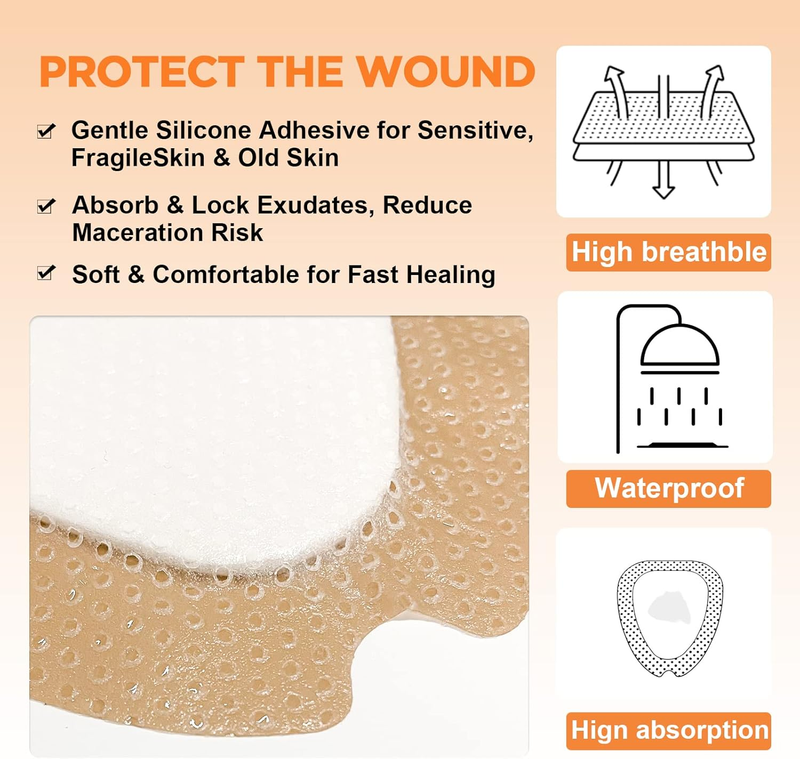 The breathable foam pad inside the silicone foam dressing absorb a large amount of wound exudate and lock the liquid, keeping the wound area clean.Thicker absorbent pads increase liquid absorption capacity and reduce the frequency of dressing changes.